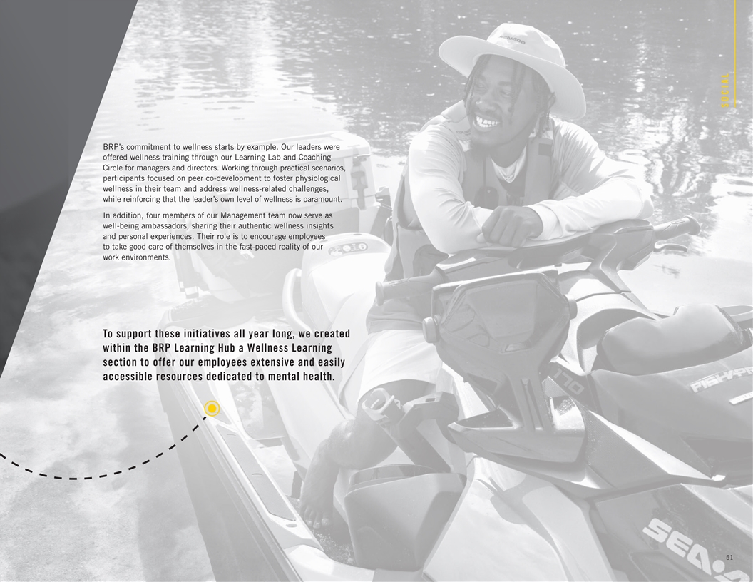 BRP对健康的承诺以身作则。我们的领导者通过我们的学习实验室和教练圈为经理和董事提供了健康培训。通过实际场景,参与者专注于同伴共同发展,以促进团队的生理健康并应对与健康相关的挑战,同时强调领导者自身的健康水平至关重要。此外,我们管理团队的四名成员现在担任健康大使,分享他们真实的健康见解和个人经历。他们的作用是鼓励员工在我们工作环境快节奏的现实中照顾好自己。为了全年支持这些举措,我们在BRP学习中心内创建了一个健康学习部分,为我们的员工提供致力于心理健康的广泛且易于获得的资源。51社会