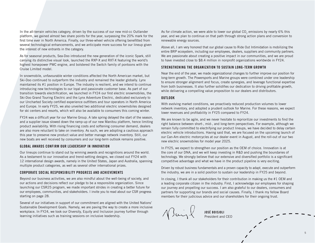 在全地形车类别中,在我们新的mid-CC Outlander至于气候行动的成功推动下,我们能够在这2个平台上将我们的全球CO排放量降低近6%,我们在这一年获得了几乎两个份额点,超过了当年的20%大关,我们计划通过强有力的行动计划和转换到北美有史以来的第一次,继续沿着这条道路前进。最后,我们的三轮车产品受益于可再生能源。几项技术改进,我们预计我们的阵容会取得更多成功。最重要的是,我非常荣幸的是,我们战胜恐吓的全球事业正在调动该类别新进入者的兴趣。整个BRP生态系统,包括我们的员工、经销商、供应商和社区合作伙伴。至于季节性产品,Sea-Doo推出了新一代标志性的Spark,仍然我们热衷于在我们的社区中创造积极的影响,并且我们自豪地携带其独特的视觉外观,推出了RXP-X和RXT-X,在24财年向全球非营利组织投资了近840万美元。最高马力的PWC引擎,并通过加强组织以维持长期增长巡航有限模式来支持Switch系列浮桥。临近年底,我们进行了组织变革,以进一步提高我们在雪地摩托的地位,不利的冬季条件影响了北美市场,但长期增长。Powersports和Marine集团合并在一个领导下,Ski-Doo继续跑赢行业,并保持全球领先地位。山猫确保更强的一致性和专注性,创造协同效应,并利用职能专长保持其在欧洲的# 1位置。该行业具有韧性,我们打算从这两项业务继续下去。它还进一步巩固了我们对推动盈利增长的奉献精神,为我们忠诚和热情的客户群引入了新技术。作为我们的一部分,同时向我们的经销商和分销商提供令人信服的价值主张。向电气化过渡,我们在24财年推出了我们的首款电动雪地摩托,即Ski-Doo Grand Touring Electric和Lynx Adventure Electric,专门用于展望我们的Uncharted Society认证的体验装备商和旅游运营商在北美随着不断变化的市场条件,我们主动将产量减少到更低和欧洲。在25财年初,我们还公布了另外两款电动雪地摩托设计的网络库存,并对Marine采取了审慎的展望。由于这些原因,我们预计滑雪中心和度假村,也将在即将到来的这个冬天向消费者开放。与24财年相比,25财年的收入和盈利能力将有所下降。24财年对我们的海事集团来说是艰难的一年。一个较晚的春季推迟了本赛季的开始,我们以敏捷着称,我们毫不犹豫地重新安排投资的优先顺序,以寻找和供应商问题减缓了我们新的Manitou平台的爬坡速度,因此限制了短期、中期和长期观点之间的适当平衡。例如,虽然我们产品可用性。随着融资成本的上升和消费者需求的软化,经销商仍然完全致力于电气化我们的产品阵容,我们决定推迟某些也更不愿意承担库存。因此,我们对电动汽车的介绍采取了谨慎的态度。话虽如此,我们专注于今年即将推出的产品,以保存新产品价值并更好地管理网络库存。尽管如此,我们的Can-AM电动摩托车在8月份的经销商活动中,以及我们两款新船的推出,都受到了消费者的好评,我们的长期前景仍然乐观。车型年2025的新电动雪地摩托。Global Awards confirm our leadership in innovation in FY25,we expect to strengthen our position as the OEM of choice。创新就在眼前我们的阵容继续通过在世界各地赢得奖项和认可而脱颖而出。作为我们DNA的核心,我们将继续投资于研发并推动边界作为对我们创新和引领趋势的设计的证明,我们以技术结束了FY24。我们坚信,我们广泛和多元化的产品组合是一个意义重大的12个国际设计奖项,分别在美国、日本和澳大利亚,跨越竞争优势和我们在产品管道中拥有的非常令人兴奋。多个产品类别,以及其他几个国际奖项。在稳健的业务基本面以及经过验证的适应、执行和超越行业的能力的推动下,我们处于稳固的地位,可以在25财年及以后保持我们的领先地位。企业社会责任的进展和成就超越我们的商业活动,我们也关注社会的福祉,最后, 我感谢所有利益相关者为使我们成为# 1代工厂所做的贡献,我们的行动和决定反映了我们对成为一个负责任组织的承诺。自行业领先的企业公民。首先,我感谢我们的员工塑造了启动我们的CSR25计划,我们在为我们的旅程创造更美好的未来和推动我们的成功方面取得了重要进展。我也感谢我们的经销商、消费者以及我们的员工、社区和利益相关者。我邀请您阅读我们的CSR进步合作伙伴支持我们的品牌和社会事业。最后,我感谢我的董事会成员从第28页开始。成员们的明智建议和我们的股东们的持续信任。我们支持我们承诺的几项倡议与联合国的可持续发展目标保持一致。也就是说,我们正在为创造一个更具包容性的工作场所铺平道路。在24财年,我们通过JOS é BOISJOLI学习计划,例如包容性领导力培训课程,让我们的多元化、公平和包容之旅走得更远。总裁兼首席执行官5