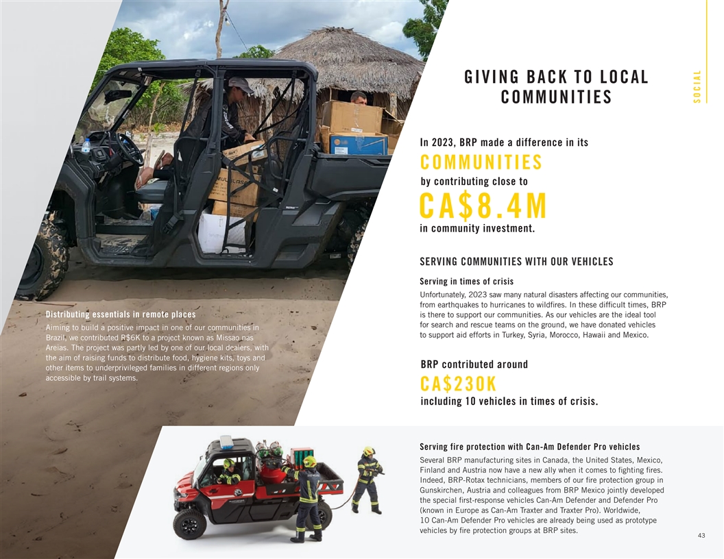 2023年,BRP回馈当地社区,通过贡献接近840万美元的社区投资,在其社区中有所作为,获得了加利福尼亚州。用我们的车辆为社区服务不幸的是,2023年发生了许多影响我们社区的自然灾害,从地震到飓风再到野火。在这些困难时期,在偏远地方分发生活必需品的BRP就在那里支持我们的社区。由于我们的车辆是地面搜救队伍的理想工具,我们捐赠了车辆,旨在在我们的一个社区建立积极影响,以支持在土耳其、叙利亚、摩洛哥、夏威夷和墨西哥的援助努力。巴西,我们为一个名为Missao nas Areias的项目贡献了6000雷亚尔。该项目部分由我们当地的一家经销商牵头,旨在筹集资金,向不同地区的贫困家庭分发食品、卫生用品包、玩具和围绕其他物品贡献的BRP,这些物品只能通过步道系统到达。加利福尼亚州 23万美元,包括危机时期的10辆车。为Can-AM Defender Pro车辆提供消防服务加拿大、美国、墨西哥、芬兰和奥地利的几个BRP制造基地现在在灭火方面有了一个新的盟友。确实,BRP-Rotax的技术人员、我们位于奥地利贡斯基兴的消防小组成员以及来自墨西哥BRP的同事们共同开发了特殊的第一响应车Can-Am Defender和Defender Pro(在欧洲被称为Can-Am Traxter和Traxter Pro)。在全球范围内,10辆Can-Am Defender Pro汽车已经被消防组织在BRP站点用作样车。43社会