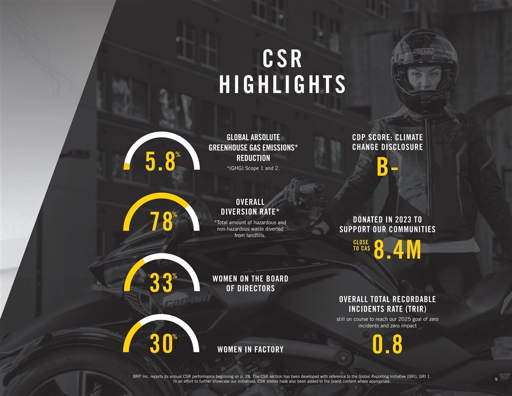 CSR重点介绍全球绝对CDP得分:气候变化披露温室气体排放*%减少*(GHG)范围1和2。5.8 B-总转移率*%于2023年捐赠给*危险废物和78种非危险废物的总量从垃圾填埋场转移支持我们的社区。接近加利福尼亚州 840万美元董事会中的女性33总可记录总事故率(TRIR)仍有望达到我们2025年零事故和零影响的目标30工厂中的女性0.8 BRP Inc.报告其从第28页开始的年度CSR业绩。CSR部分是参照全球报告倡议组织(GRI),GRI 1开发的。9为了进一步展示我们的举措,还酌情在品牌内容中添加了CSR故事。