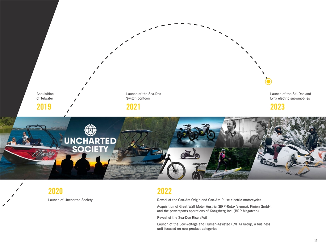 收购启动Sea-Doo推出Ski-Doo和Telwater Switch浮桥Lynx电动雪地摩托20192021202320202022推出Uncharted Society揭示Can-AM起源和Can-AM脉冲电动摩托车收购长城汽车奥地利公司(BRP-Rotax Vienna)、Pinion GmbH,以及Kongsberg Inc.(BRP Megatech)的powersports运营揭示Sea-Doo Rise eFoil推出低压和人力辅助(LVHA)集团,一个专注于新产品类别的业务部门11