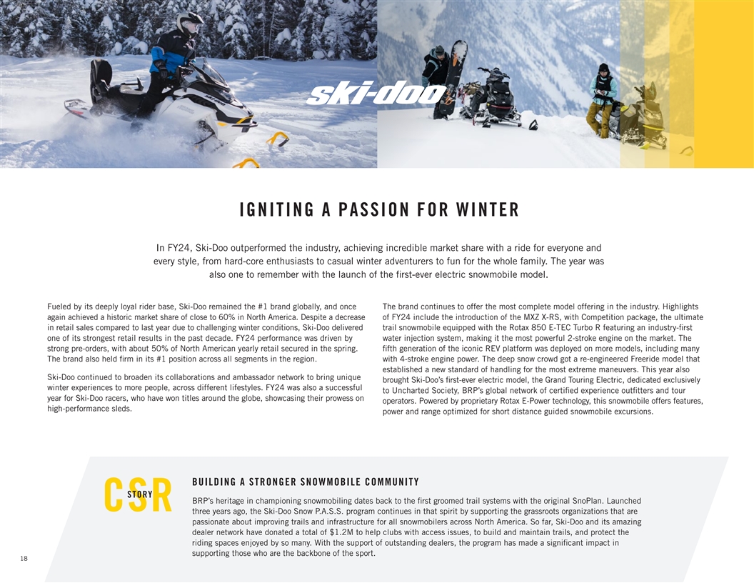 在24财年点燃了对冬季的热情,Ski-Doo的表现超越了行业,从硬核爱好者到休闲冬季冒险家,再到全家的乐趣,每个人和每一种风格都能搭上顺风车,取得了令人难以置信的市场份额。随着首款电动雪地摩托车型的推出,这一年也值得铭记。在其忠实的骑手基础的推动下,Ski-Doo仍然是全球排名第一的品牌,一旦该品牌继续提供业内最完整的车型。Highlights在北美再次实现了接近60%的历史性市场份额。尽管FY24有所下降,包括推出了MXZ X-RS,带有竞争套件,由于冬季条件具有挑战性,与去年相比,零售销售达到了极致,但Ski-Doo交付了配备Rotax 850 E-TEC Turbo R的越野雪地摩托,其特点是在过去十年中取得了业界首个最强劲的零售成绩。FY24业绩由注水系统驱动,使其成为市场上最强大的2冲程发动机。强劲的预购,约50%的北美年度零售在春季获得。第五代标志性的REV平台被部署在更多车型上,包括许多该品牌也在该地区所有细分市场中稳居# 1的位置。拥有4冲程发动机动力。深雪人群得到了重新设计的Freeride模型,该模型为最极端的机动动作建立了新的操控标准。今年,Ski-Doo还继续拓宽合作和大使网络,带来独特带来的Ski-Doo首款电动车型Grand Touring Electric,为更多人奉献专属的冬季体验,跨越不同的生活方式。FY24对Uncharted Society来说也是成功的,这是BRP的全球认证体验服装商网络,也是Ski-Doo赛车手的巡回赛年,他们在全球各地赢得了冠军,在运营商身上展示了他们的实力。这款雪地摩托由专有的Rotax E-Power技术提供动力,提供了针对短距离引导雪地摩托远足而优化的功能、高性能雪橇。功率和续航里程。打造更强大的雪地摩托社区故事BRP倡导雪地摩托的传统可以追溯到第一个使用最初的SnoPlan修饰的步道系统。三年前推出CSR的Ski-Doo Snow P.A.S.S.计划继续本着这种精神,支持那些热衷于为北美所有雪地摩托车手改善步道和基础设施的基层组织。到目前为止,Ski-Doo及其令人惊叹的经销商网络已经捐赠了总计120万美元,用于帮助俱乐部解决准入问题,建造和维护小径,并保护这么多人享受的骑行空间。在优秀经销商的支持下,该计划在支持那些作为这项运动的中坚力量方面产生了重大影响。18