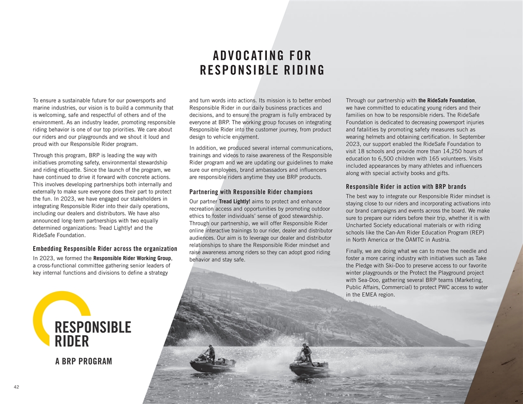 倡导负责任的骑行,以确保我们的动力运动有一个可持续的未来,并将言语转化为行动。其使命是通过我们与RideSafe基金会、海洋行业的合作伙伴关系,更好地嵌入我们的愿景,即在我们的日常业务实践中建立一个负责任骑手的社区,我们致力于教育年轻骑手及其对他人和决策的欢迎、安全和尊重,并确保该计划在如何成为负责任骑手方面得到家庭的充分接受。RideSafe环境。作为行业领军企业,在BRP推广负责任的每个人。工作组专注于整合Foundation致力于减少powersport伤害骑行行为是我们的首要任务之一。我们关心负责任的骑手进入客户旅程,从产品和死亡通过推广安全措施,如我们的骑手和我们的游乐场和我们大声喊它和设计到车辆享受。戴上头盔并获得认证。在9月,我们以负责任的骑手计划而自豪。2023,我们的支持使得RideSafe基金会此外,我们制作了几份内部通讯,访问了18所学校并提供了超过14,250小时的通过这个计划,BRP正在引领,以培训和视频的方式与165名志愿者向6500名儿童提高对责任教育的认识。访问促进安全、环境管理骑手计划的倡议,我们正在更新我们的指导方针,让许多运动员和影响者以及骑行礼仪参与其中。自该计划上线以来,我们向我们的员工、品牌大使和网红们保证伴随着特别的活动书籍和礼物。以具体的行动持续推动着它前行。都是随时使用BRP产品的负责任的骑手。这涉及到对内发展伙伴关系,对外与BRP品牌在行动中发展负责任的骑手,以确保每个人都尽自己的一份力量来保护与负责任的骑手冠军搭档。整合我们负责任的骑手思维的最佳方式就是乐趣。2023年,我们让我们的利益相关者参与了我们的合作伙伴Tread Lightly!旨在通过全面推广户外我们的品牌活动和活动,保护和加强与我们的骑手保持密切联系,并将激活活动纳入将Responsible Rider融入他们的日常运营、娱乐活动和机会中。We make including our dealers and distributors。我们也有培养个人良好管理意识的道德。一定要在我们的骑手出行前做好准备,无论是与已宣布的长期合作伙伴关系,与两个平等通过我们的合作伙伴关系,我们将提供负责任的骑手神秘社会教育材料,还是与骑行坚定的组织:轻踏!以及对我们的骑手、经销商和分销商学校的在线互动培训,比如Can-AM骑手教育计划(REP)RideSafe基金会。观众。我们的目标是利用我们在北美的经销商和分销商或奥地利的Ö AMTC。关系分享负责任的骑手心态,并在整个组织中嵌入负责任的骑手最后,我们正在尽我们所能移动针头,提高骑手的意识,以便他们能够在2023年采用良好的骑行,我们组建了负责任的骑手工作组,通过Take behavior和stay safe等举措培育一个更有爱心的行业。一个跨职能委员会将Pledge的高级领导与Ski-Doo聚集在一起,以保留对我们最喜欢的关键内部职能和部门的访问权限,以定义一个战略冬季游乐场或与Sea-Doo保护游乐场项目,召集几个BRP团队(营销、公共事务、商业),以保护PWC在EMEA地区的用水渠道。42