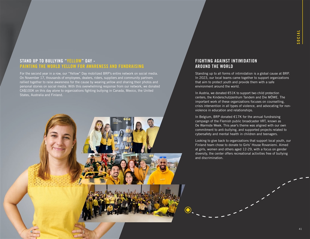 挺起霸凌“黄”日——与恐吓斗争将世界描绘成黄连续第二年在全球范围内筹款,我们的“黄”日在社交媒体上动员了BRP的全网。在BRP,经得起各种形式的恐吓是一项全球性的事业。11月17日,数千名员工、经销商、骑手、供应商和2023年的社区合作伙伴,我们当地的团队聚集在一起,支持组织通过穿黄色衣服和分享他们的照片来提高对这项事业的认识,旨在保护年轻人并在社交媒体上为他们提供安全的个人故事。有了我们网络的这种热烈反响,我们在世界各地捐赠了环境。仅在这一天,加利福尼亚州就向加拿大、墨西哥、奥地利的联合社等打击欺凌行为的组织捐赠了10万欧元,我们捐赠了5.1万欧元,用于支持澳大利亚和芬兰这两个儿童保护州的中心,即Kinderschutzzentrum Tandem和Die M ö WE。这些组织的重要工作集中在辅导、所有类型暴力的危机干预,以及倡导教育和关系中的非暴力。在比利时,BRP为弗拉芒公共广播公司VRT的年度筹款活动捐赠了17,000欧元,该活动被称为De Warmste Week。今年的主题与我们自己对反欺凌的承诺保持一致,并支持与网络安全和儿童和青少年心理健康相关的项目。为了回馈支持当地青年的组织,我们的芬兰团队选择向女孩之家Rovaniemi捐款。该中心针对12-29岁的女孩、妇女和其他人,重点关注性别多样性,提供不受欺凌和歧视的娱乐活动。41社会