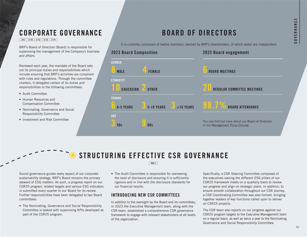 公司治理董事会2-9 2-10 2-12 2-13 2-14目前由十二名成员组成,由BRP的股东选举产生,其中七名为独立董事。BRP的董事会(董事会)负责监督公司业务管理2023董事会组成2023董事会聘用和事务。每年对性别平等进行审查后,董事会的任务规定了其主要职责和责任,8名男性4名女性6名董事会会议包括确保BRP的活动符合规则和条例。通过委员会的族裔章程,它将其某些职责和责任委托给以下委员会:10高加索2其他20定期委员会会议•审计委员会任期•人力资源和薪酬委员会6 0-5年3 5-10年3 > 10年98.7%董事会出席率•提名、治理和社会责任委员会年龄•投资和风险委员会您可以在我们的管理层代理通函中了解更多关于我们董事会350960的信息。构建有效的CSR治理404-1健全的治理指导着我们企业的每一个方面•审计委员会负责监督具体来说,是一个由可持续发展战略组成的CSR指导委员会。BRP的董事会仍然是披露层面的首要角色,并确保充分由高管拥有我们ESG事务管家的不同ESG支柱。因此,一份关于我们严格且符合CSR25框架披露标准的进展报告每季度举行一次会议,以审查CSR25计划、相关目标和各种ESG指标我们的财务业绩。我们的进展并与战略计划保持一致。此外,to每季度提交给我们的董事会供其审查。确保在我们的CSR旅程中顺利协作,进一步的职责已下放给两个董事会一个CSR协调委员会也已成立,带来了新的CSR委员会委员会:在CSR25项目上,除了董事会及其委员会的监督之外,还被要求履行的关键职能的领导人一起。• 2023年的提名、治理和社会责任,执行管理团队与委员会的任务是监督制定的KPI,因为CSR团队还报告了我们与CSR团队的进展,建立了CSR25计划的全面CSR治理部分。CSR25计划的目标是执行管理团队框架定期与各级相关利益攸关方接触,并每年两次与该组织的提名进行接触。治理和社会责任委员会。55治理