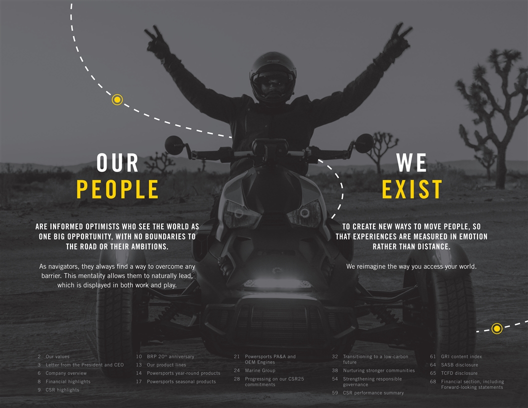 我们这些人的存在是知情的乐观主义者,他们将世界视为创造新的方式来移动人们,所以这是一个巨大的机会,没有任何界限,经验是在情感道路或他们的野心中衡量的。而不是距离。作为领航者,他们总能找到一种方法来克服任何我们重新想象你进入你的世界的方式。障碍。这种心态让他们能够自然而然地领先,这在工作和娱乐中都得到了体现。th 2我们的价值观10 BRP 20周年21 Powersports PA & A和32向低碳转型61 GRI内容指数OEM引擎未来3总裁兼首席执行官的信13我们的产品线64 SASB披露24海洋集团38培育更强大的社区6公司概览14 Powersports全年产品65 TCFD披露28在我们的CSR25上取得进展54加强责任8财务亮点17 Powersports季节性产品68财务部分,包括承诺治理前瞻性陈述9 CSR亮点59 CSR业绩摘要