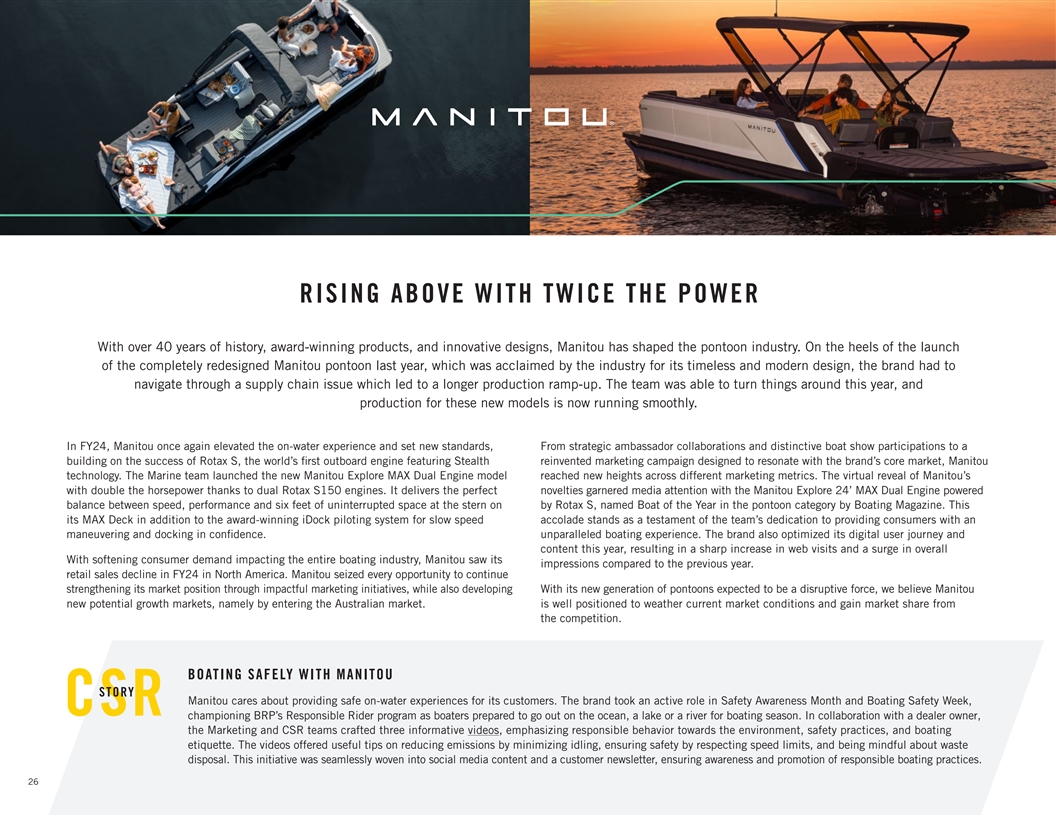 以超40年的历史、屡获殊荣的产品、创新的设计,以两倍的力量拔地而起,曼尼图塑造了浮桥产业。在去年推出完全重新设计的Manitou浮桥之后,该浮桥因其永恒和现代的设计而受到业界的好评,该品牌不得不通过供应链问题进行导航,这导致了更长的生产爬坡。该团队今年得以扭转局面,目前这些新车型的生产运行顺利。24财年,Manitou再次提升了水上体验并设定了新标准,从战略大使合作和独特的船展参与,到建立在Rotax S成功的基础上,Rotax S是世界上第一个采用Stealth重新发明的营销活动的舷外引擎,旨在与品牌的核心市场Manitou技术产生共鸣。Marine团队推出了全新的Manitou Explore MAX双引擎模型,在不同的营销指标上达到了新的高度。得益于双Rotax S150发动机的双倍马力Manitou的虚拟揭秘。它提供了获得媒体关注的完美新奇之处,由Rotax S驾驶的Manitou Explore 24’MAX双引擎动力平衡速度、性能和船尾六英尺不间断空间,被Boating Magazine评为浮船类别的年度最佳船。这款它的MAX Deck除了屡获殊荣的iDock领航系统获得慢速荣誉外,还证明了该团队致力于为消费者提供一种充满信心的操纵和对接。无与伦比的划船体验。该品牌今年还优化了其数字用户旅程和内容,导致网页访问量急剧增加,整体激增随着消费者需求疲软影响整个划船行业,Manitou看到了与前一年相比的印象。北美地区24财年的零售额下降。Manitou抓住每一个机会,通过有影响力的营销举措继续加强其市场地位,同时也随着其新一代浮桥的发展有望成为一股颠覆性的力量,我们认为Manitou新的潜在增长市场,即通过进入澳大利亚市场。有能力经受住当前的市场条件并从竞争中获得市场份额。与Manitou Story安全划船Manitou关心为客户提供安全的水上体验。该品牌在安全宣传月和划船安全周中发挥了积极作用,这是CSR支持BRP的责任骑手计划,因为划船者准备在海洋、湖泊或河流上划船季节。营销和CSR团队与一位经销商老板合作,制作了三个内容丰富的视频,强调对环境负责的行为、安全实践和划船礼仪。这些视频提供了通过最大限度减少怠速来减少排放、通过遵守速度限制来确保安全以及注意废物处理的有用技巧。这一举措被无缝编织到社交媒体内容和客户通讯中,确保了对负责任的划船做法的认识和推广。26