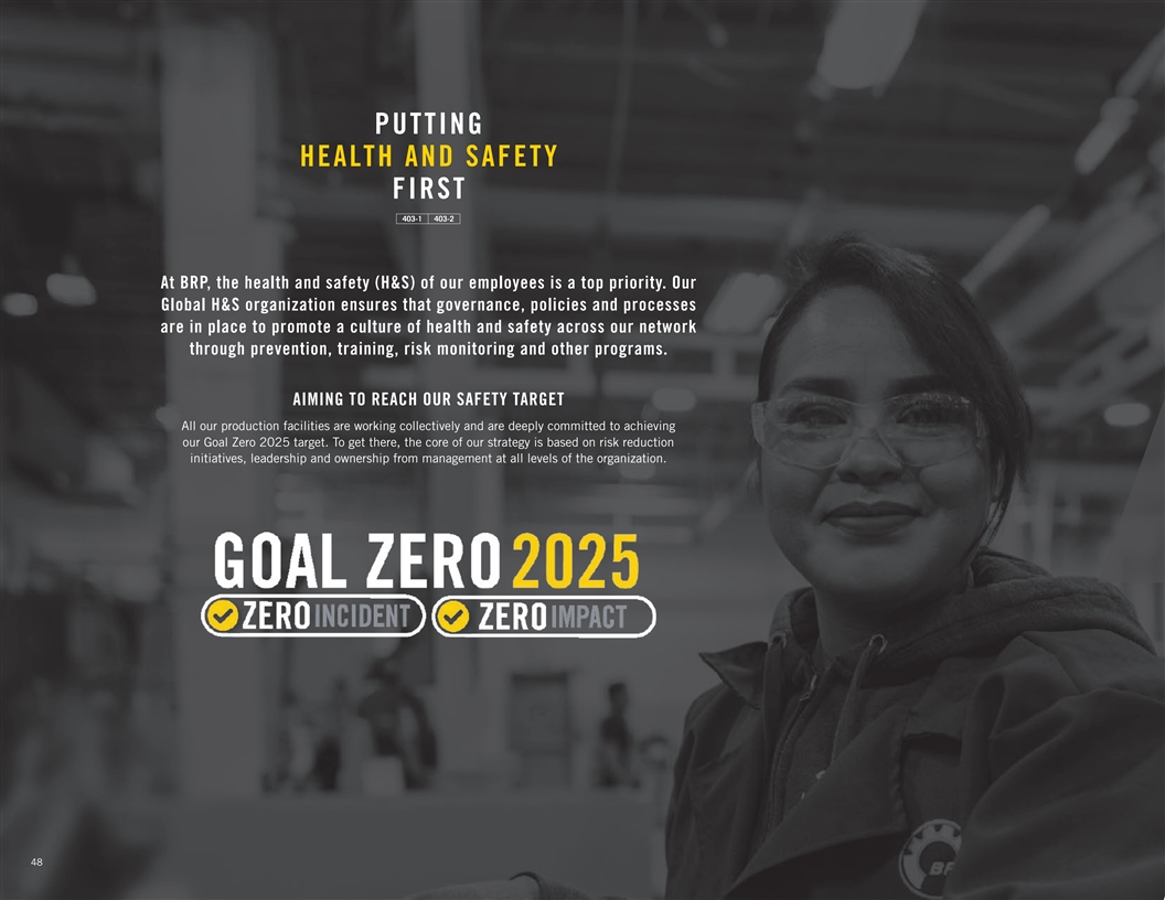 将健康和安全放在首位403-1 403-2在BRP,我们员工的健康和安全(H & S)是重中之重。我们的全球H & S组织确保通过预防、培训、风险监测和其他计划,制定治理、政策和流程,在我们的网络中促进健康和安全文化。旨在达到我们的安全目标我们所有的生产设施都在集体努力,并坚定地致力于实现我们的目标零2025目标。为了实现这一目标,我们战略的核心是基于组织各级管理层的风险降低举措、领导力和所有权。48