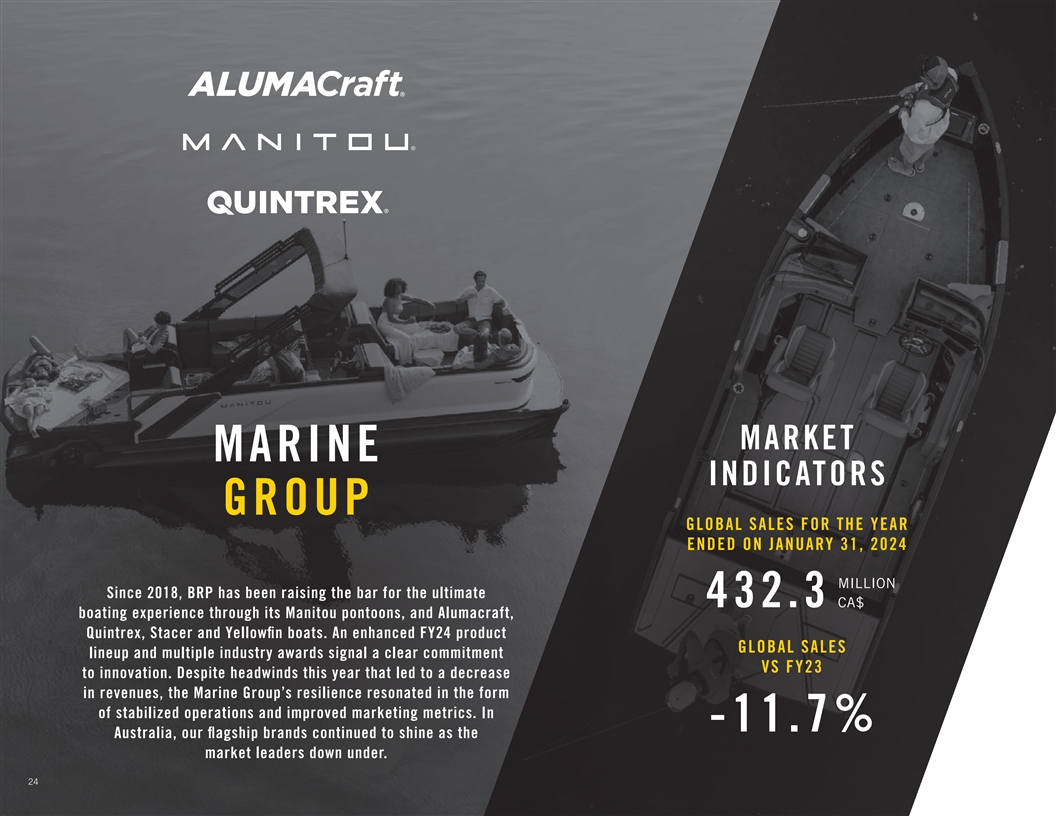 ® Market Marine Indicators Group截至2022年1月31日止年度的全球销售额为2024年百万,自2018年以来,BRP通过其Manitou浮桥以及Alumacraft、Quintrex、Stacer和YellowFin船,一直在提高终极432.3 加利福尼亚州 $划船体验的标准。增强的FY24产品全球销售阵容和多个行业奖项标志着与FY23相比,对创新的明确承诺。尽管今年的逆风导致收入下降,但海运集团的韧性以稳定运营和改进营销指标的形式产生了共振。在-11.7 %澳大利亚,随着市场领导者的倒下,我们的旗舰品牌继续大放异彩。24