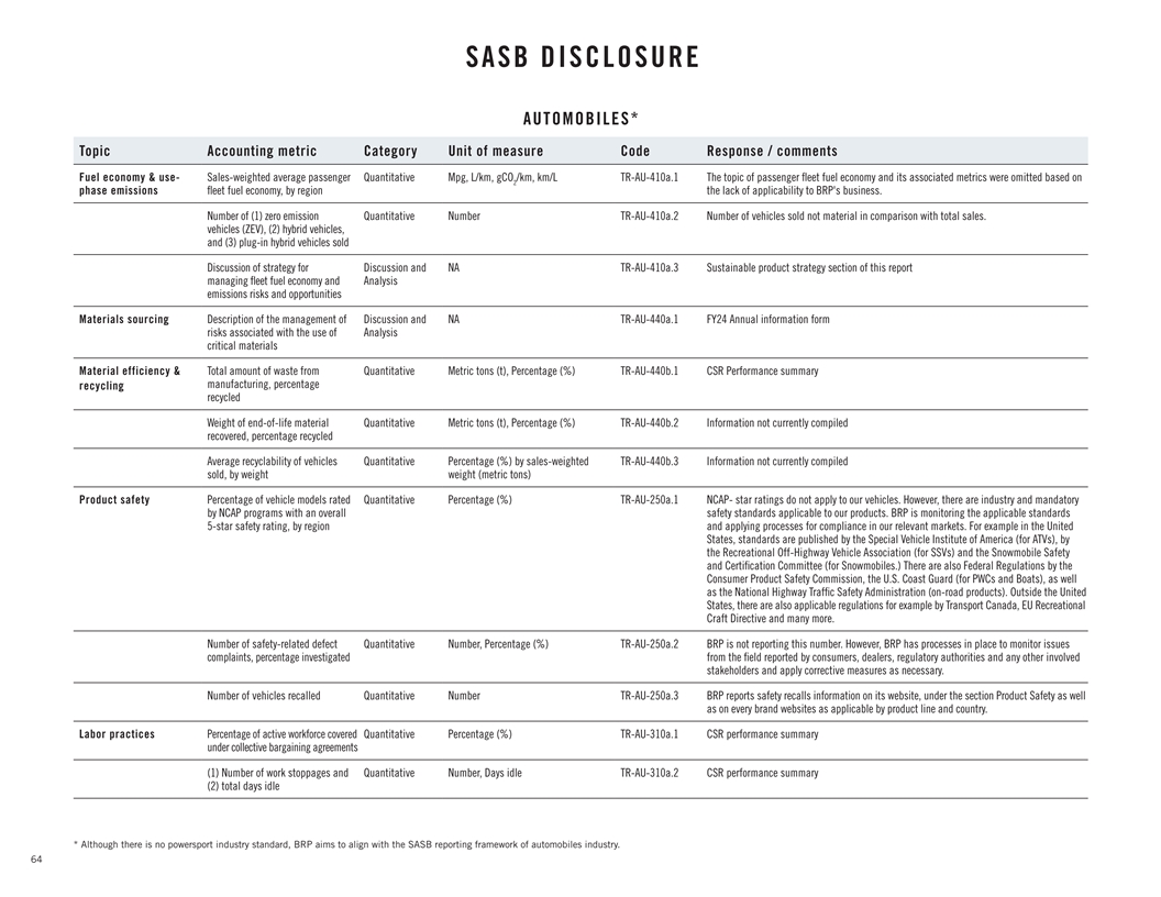 SASB披露汽车*主题会计指标类别计量单位代码回复/评论燃油经济性&使用-销售加权平均乘客定量MPG,L/km,gCO/km,km/L TR-AU-410a.1基于2阶段排放的车队燃油经济性,省略了客运车队燃油经济性及其相关指标的主题,按地区划分,缺乏对BRP业务的适用性。数量(1)零排放量化数量TR-AU-410a.2售出的汽车数量与总销量相比并不重要。车辆(ZEV),(2)混合动力汽车,以及(3)插电式混合动力汽车售出的战略讨论供讨论和NA TR-AU-410a.3本报告可持续产品战略部分管理车队燃油经济性和分析排放风险和机会材料来源讨论和NA TR-AU-440a.1 FY24年度信息表与使用分析关键材料相关的风险材料效率&来自定量公吨(t)的废物总量,百分比(%)TR-AU-440b.1 CSR性能摘要制造,报废材料回收百分比回收重量定量公吨(t),百分比(%)TR-AU-440b.2目前未汇编回收的信息,百分比回收车辆平均可回收性定量百分比(%)按销售加权TR-AU-440b.3目前未汇编销售的信息,按重量重量(公吨)产品安全车型额定百分比定量百分比(%)TR-AU-250a.1 NCAP-星级不适用于我们的车辆。然而,有适用于我们产品的整体安全标准的行业和强制性NCAP计划。BRP正在按地区和申请流程对适用标准5星安全评级进行监测,以确保我们相关市场的合规性。例如在美国,标准由美国特种车辆协会(ATV)、休闲非公路车辆协会(SSV)和雪地摩托安全和认证委员会(雪地摩托)发布。还有联邦法规由消费品安全委员会、美国海岸警卫队(PWC和船只)以及美国国家公路交通安全管理局(公路产品)发布。在美国以外,也有适用的法规,例如加拿大交通部、欧盟休闲工艺指令等等。数量安全相关缺陷定量数量、百分比(%)TR-AU-250a.2 BRP未报告此数字。但是,BRP制定了流程来监控问题投诉、消费者、经销商、监管机构和任何其他相关利益相关者报告的实地调查百分比,并根据需要应用纠正措施。召回车辆数量数量数量数量数量数量数量数量数量数量数量数量数量数量数量数量数量数量数量数量数量数量数量数量数量数量数量数量数量数量召回数量数量数量数量数量数量数量数量数量数量数量数量数量数量数量数量数量数量数量数量数量数量数量数量数量数量数量数量数量数量数量数量数量数量数量数量数量数量数量数量数量数量数量数量数量数量数量数量数量数量数量数量数量数量数量数量数量数量数量数量数量数量数量数量数量数量数量数量数量数量数量数量数量数量数量数量数量数量数量数量数量数量数量数量数量数量数量数量数量数量数量数量数量数量数量数量数量数量数量数量数量数量数量数量数量数量劳动实践现役劳动力覆盖百分比量化百分比(%)TR-AU-310a.1集体谈判协议下的CSR绩效摘要(1)停工次数和量化数量、闲置天数TR-AU-310a.2 CSR绩效摘要(2)总闲置天数*尽管没有powersport行业标准,但BRP旨在与汽车行业SASB报告框架保持一致。64