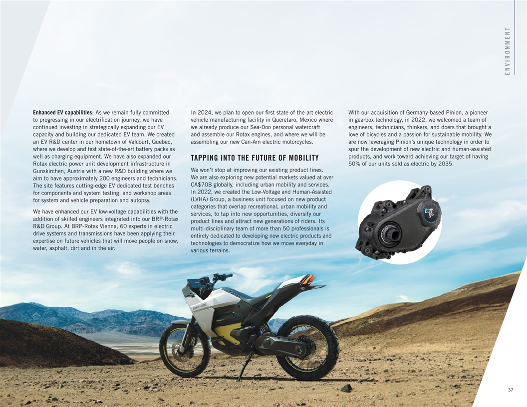 增强的电动汽车能力:由于我们在2024年仍然完全致力于,我们计划通过收购总部位于德国的Pinion(在我们的电气化之旅中取得进展的先驱)来开设我们的第一个最先进的电动汽车。我们在墨西哥克雷塔罗设有车辆制造工厂,在变速箱技术方面,2022年,我们迎来了一支持续投资的团队,以战略性地扩展我们的电动汽车,我们已经生产了我们的Sea-Doo个人船只工程师、技术人员、思想家和实干家,他们带来了能力并建立了我们专门的电动汽车团队。我们创造并组装了我们的Rotax引擎,我们将在那里热爱自行车和对可持续移动的热情。我们是家乡魁北克省瓦尔考特的一家电动汽车研发中心,正在组装我们新的Can-AM电动摩托车。现在正在利用Pinion的独特技术,以便我们在那里开发和测试最先进的电池组,以刺激新的电动和人工辅助以及充电设备的开发。我们还扩展了我们的产品,并努力实现我们的目标,即到2035年,在我们销售的50%的机组中,我们的移动Rotax电力单元开发基础设施将融入未来。我们不会止步于改进现有的产品线。奥地利Gunskirchen有一座新的研发大楼,我们也在那里探索新的潜在市场,估值超过目标是拥有大约200名工程师和技术人员。全球加利福尼亚州 $ 70B,包括城市出行和服务。该网站设有尖端的电动汽车专用测试台2022年,我们创建了用于组件和系统测试的低压和人工辅助,以及车间区域(LVHA)集团,这是一个专注于系统和车辆准备和汽车解剖新产品的业务部门。与娱乐、城市移动和我们的服务重叠的类别增强了我们的电动汽车低压能力,以挖掘新的机会,使我们增加融入我们BRP-Rotax产品线的熟练工程师,并吸引新一代的骑手。其研发集团。在BRP-Rotax维也纳,由50多名专业人士组成的60名电动多学科专家团队是驱动系统和变速器,他们一直在应用他们完全致力于开发新的电动产品和未来车辆上的专业知识,这些产品将在雪地上移动人员,这些技术将使我们在水中、沥青、泥土和空气中的日常移动方式民主化。各种地形。37环境