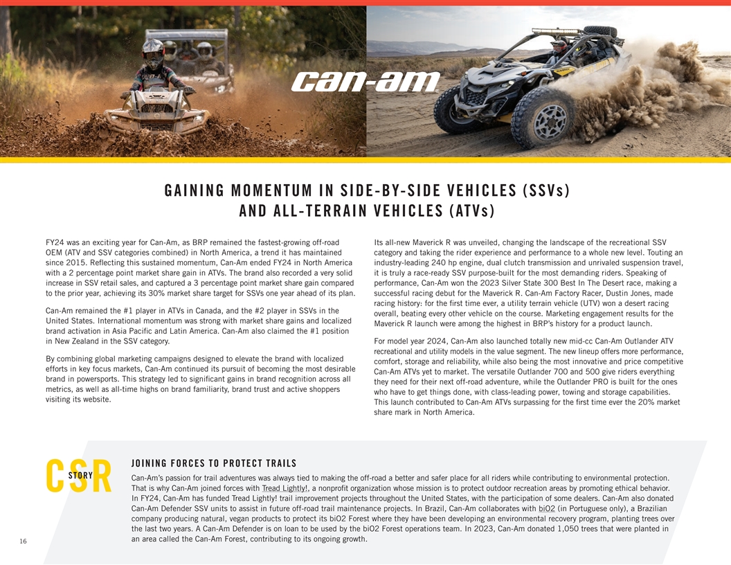 获得并驾齐驱SSV(SSV)和全地形车(ATV)的势头对于Can-AM来说,24财年是激动人心的一年,因为BRP仍然是增长最快的越野车型,其全新的Maverick R亮相,改变了北美休闲SSV OEM(ATV和SSV品类相结合)的格局,它保持了这一趋势,并将骑手体验和性能提升到了一个全新的水平。自2015年以来一直在兜售。反映了这种持续的势头,Can-AM在北美行业领先的240马力发动机、双离合变速器和无与伦比的悬架旅行结束了24财年,在全地形车中的市场份额增加了2个百分点。该品牌还记录了一个非常坚实的它确实是一款专为最苛刻的骑手打造的适合比赛的SSV。说到SSV零售销量的增长,以及相比表现拿下3个百分点的市场份额增长,Can-AM赢得了2023年沙漠赛跑银州300最佳,与前一年相比,提前一年实现了SSV 30%的市场份额目标。Maverick R. Can-AM Factory赛车手达斯汀·琼斯的成功赛车首秀创造了赛车历史:有史以来第一次,一辆多功能地形车(UTV)赢得了沙漠赛跑Can-AM仍然是加拿大ATV排名第一的选手,整体SSV排名第二的选手,击败了球场上的所有其他车辆。美国的营销参与结果。国际势头强劲,市场份额增加,本地化Maverick R的推出位居BRP历史上产品推出的最高水平之一。在亚太地区和拉丁美洲的品牌激活。Can-AM还在SSV类别中获得了新西兰排名第一的位置。针对2024款车型,Can-AM还在价值细分领域推出了全新的中型CC Can-AM欧蓝德ATV休闲和实用新型。新阵容提供了更多性能,通过结合旨在提升品牌与本地化舒适、存储和可靠性的全球营销活动,同时也是关键焦点市场中最具创新性和价格竞争力的努力,Can-AM继续追求成为尚未上市的最受欢迎的Can-AM ATV。多才多艺的欧蓝德700和500在powersports中为骑手们赋予了一切品牌。这一战略在他们下一次越野冒险所需的一切方面带来了品牌认知度的显着提升,而欧蓝德PRO则是为这些指标打造的,以及在品牌熟悉度、品牌信任度和必须完成工作的活跃购物者方面的历史新高,具有一流的动力、牵引和存储能力。访问其网站。此次发布促成了Can-AM ATV首次超越北美20%的市场份额大关。联手保护小道故事Can-AM对越野冒险的热情始终与让越野成为所有骑手更好、更安全的地方,同时为环境保护做出贡献联系在一起。这就是为什么Can-AM与Tread Lightly!联手的原因,这是一个非营利组织,其使命是通过促进道德行为来保护户外休闲区。CSR在FY24,Can-AM资助了Tread Lightly!美国各地的步道改善项目,部分经销商参与。Can-AM还捐赠了Can-AM Defender SSV单元,以协助未来的越野步道维护项目。在巴西,Can-AM与生产天然纯素产品的巴西公司biO2(仅限葡萄牙语)合作,以保护其biO2森林,他们一直在那里开发环境恢复计划,在过去两年里种植树木。Can-AM Defender被租借给生物二氧化碳林运营团队使用。2023年,Can-AM捐赠了1,050棵树,种植在一个名为Can-AM森林的地区,为其持续增长做出了贡献。16