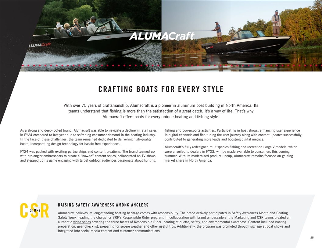 ® Alumacraft拥有超过75年的工艺,为每一种风格制作船只,是北美铝制船制造的先驱。它的团队明白,钓鱼不仅仅是一次大渔获的满足,它是一种生活方式。这就是为什么Alumacraft为每一种独特的划船和钓鱼风格提供船只。作为一个强大且根深蒂固的品牌,Alumacraft能够在零售销售下降的钓鱼和动力运动活动中度过难关。参加船展,由于划船行业的消费者需求疲软,与去年相比,在24财年增强了用户体验。在数字渠道和随着内容更新成功地微调用户旅程方面,面对这些挑战,团队仍然致力于交付高质量的产品,为产生更多的潜在客户和推动数字衡量标准做出了贡献。船艇,融入了无忧体验的设计技术。Alumacraft完全重新设计的多物种捕鱼和娱乐大V模型,24财年充满了令人兴奋的合作伙伴关系和内容创作。该品牌联手于23财年向经销商亮相,将于今年与支持垂钓者的大使一起向消费者提供,以打造“操作方法”内容系列,在电视节目、夏季进行合作。凭借其现代化的产品阵容,Alumacraft仍然专注于获得并加强其游戏与对狩猎充满热情的目标户外受众的互动,在北美的市场份额。提高Anglers Story中的安全意识Alumacraft相信,其悠久的划船传统伴随着责任。该品牌积极参与安全宣传月和划船CSR安全周活动,为BRP责任骑手计划冲锋在前。营销和CSR团队协同品牌大使,打造了涵盖责任骑手三个方面的真实视频系列:划船礼仪、安全、环保意识。内容包括划船准备、齿轮检查表、恶劣天气准备等有用提示。此外,该项目还通过船展上的标牌进行推广,并融入社交媒体内容和客户沟通。25