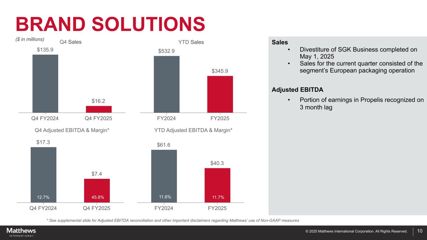 ©2025 Matthews International Corporation。版权所有。BrandSOLUTIONS Sales • SGK业务剥离于5月1日完成,2025年•本季度销售额包括该部门的欧洲包装业务调整后EBITDA •在Propelis中按滞后3个月确认的部分收益(百万美元)*见补充幻灯片,了解调整后EBITDA对账和有关Matthews使用非公认会计原则措施的其他重要免责声明1015.4% 12.9% $ 135.9 $ 16.2 Q4 FY2024 Q4 FY2025 $ 532.9 $ 345.9 FY2024 FY2025 $ 17.3 $ 7.4 Q4 FY2024 Q4 FY2025 $ 61.6 $ 40.3 FY2024 FY2025 45.8% 12.7% 11.6% 11.7% Q4 sales Q4 adjusted EBITDA & margin*年初至今销售额年初至今调整后EBITDA &利润率*