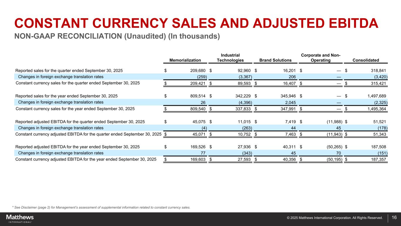 ©2025 Matthews International Corporation。版权所有。调整后的净收入和每股收益非公认会计原则对账(未经审计)(以千为单位,每股数据除外)*请参阅免责声明(第2页),了解管理层对与调整后净收入和调整后每股收益相关的补充信息的评估。15截至9月30日止三个月,截至9月30日止年度,2025202420252024每股每股收益每股净亏损归属于Matthews $(27,470)$(0.88)$(68,161)$(2.21)$(24,471)$(0.79)$(59,660)$(1.93)收购和剥离项目(1)1,7580.068370.037,5650.254,8730.16战略举措和其他费用(2)19,3840.6341,2611.3533,9001.0957,0731.85出售SGK业务收益7,9970.25 ——(6,158)(0.20)——高通胀会计影响(主要是非现金)(3)990.01 132 — 1,1350.04 1,0270.03商誉和资产减记(4)7,9110.2632,7841.067,9110.2632,7841.06非服务养老金和退休后费用(5)107 — 83 — 4120.01 3290.01无形资产摊销费用2,7810.096,9240.2315,0520.48 27,7670.90 Propelis摊销和其他不寻常项目(6)2,4790.08 —— 2,4790.08 ——与税收相关(7)—— 2,7030.09 1,2070.04 2,8390.09调整后净收入$ 15,046 $ 0.50 $ 16,563 $ 0.55 $ 39,032 $ 1.26 $ 67,032 $ 2.17注:非公认会计准则调节项目的净收入调整计算时分别使用截至2025年9月30日和2024年9月30日止三个月的所得税税率15.4%和7.4%,以及截至2025年9月30日和2024年9月30日止财政年度的所得税税率分别为14.8%和11.5%。(1)包括与近期收购和剥离活动相关的某些非经常性成本,还包括2023财年与剥离工业技术部门业务相关的收益。(2)包括与商业、运营和成本削减举措相关的某些非经常性成本,以及与全球ERP系统集成工作相关的成本。还包括与特斯拉公司(“特斯拉”)的持续纠纷相关的法律费用,截至2025年9月30日和2024年9月30日止三个月的总额分别为7747美元和4261美元,截至2025年9月30日和2024年9月30日止财政年度的总额分别为22166美元和12399美元。2025财年包括与公司2025年有争议的代理权相关的费用,总计5109美元。截至2025年9月30日的三个月和财政年度包括与解决一项合同法律事项相关的8000美元费用。2025财年包括出售某些重要财产和其他资产的净收益3556美元。2025财年包括总额1708美元的损失赔偿,这些损失与此前披露的一名最初在2015财年被发现的前雇员盗窃资金有关。(3)表示与公司土耳其子公司相关的高度通货膨胀会计相关的汇兑损益(4)2025财年包括品牌解决方案部门截至2025年9月30日的三个月和财政年度的资产减记7911美元。2024财年包括工业技术部门的商誉减记、纪念部门的资产减记以及公司和非经营部门的投资减记。(5)非服务养老金和退休后费用包括利息成本、计划资产预期收益率、精算损益摊销、限电损益、结算损益。这些福利成本部分不包括在调整后的EBITDA中,因为它们主要受到影响投资回报和利率(贴现)率的外部市场条件的影响。缩减损益和结算损益不包括在调整后的EBITDA中,因为它们通常是由某些非经常性事件引起的,例如修改未来福利的计划修订或计划义务的结算。养老金和退休后费用的服务成本和先前服务成本部分包括在调整后EBITDA的计算中,因为它们被认为更能反映提供这些福利的持续服务相关成本。请注意,GAAP养老金和退休后费用或上述调整不一定表明与这些员工福利计划相关的当前或未来现金流需求。(6)代表公司对Propelis产生的折旧、无形摊销、利息费用、其他项目部分。(7)2025财年是指与公司先前在俄罗斯注销的资产相关的税务相关项目,截至9月30日的三个月和财年, 2024年包括与重组相关的2703美元税收相关项目,这些项目导致递延税收资产注销。2024财年还包括与终止确认一家正在终止的合资企业的递延所得税资产有关的136美元的税务相关项目。*每股金额基于每个相应期间的稀释股份。