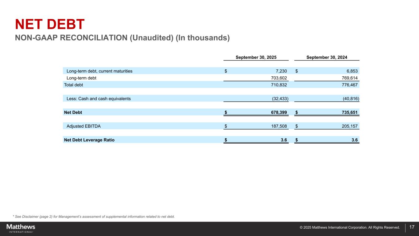 ©2025 Matthews International Corporation。版权所有。*请参阅免责声明(第2页),了解管理层对与净债务相关的补充信息的评估。2025年9月30日17日2024年9月30日长期债务,当前到期日$ 7,230 $ 6,853长期债务703,602769,614总债务710,832776,467减:现金及现金等价物(32,433)(40,816)净债务$ 678,399 $ 735,651调整后EBITDA $ 187,508 $ 205,157净债务杠杆率$ 3.6 $ 3.6净债务Non-GAAP对账(未经审计)(单位:千)