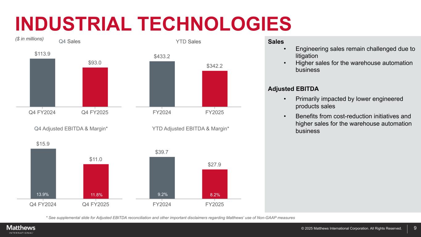©2025 Matthews International Corporation。版权所有。工业技术*见补充幻灯片,了解调整后EBITDA对账和有关Matthews使用非公认会计原则措施的其他重要免责声明915.5% 12.4% 15.6% 10.3%销售额•工程销售仍因诉讼而受到质疑•仓库自动化业务调整后EBITDA销售额增加•主要受到工程产品销售额下降的影响•成本削减举措带来的好处仓库自动化业务的销售额增加(百万美元)$ 113.9 $ 93.0 Q4 FY2024 Q4 FY2025 $ 433.2 $ 342.2 FY2024 FY2025 $ 15.9 $ 11.0 Q4 FY2024 Q4 FY2025 $ 39.7 $ 27.9 FY2024 FY2025 13.9% 11.8% 9.2% 8.2% Q4销售额Q4调整后EBITDA &利润率*年初至今销售额年初至今调整后EBITDA &利润率*
