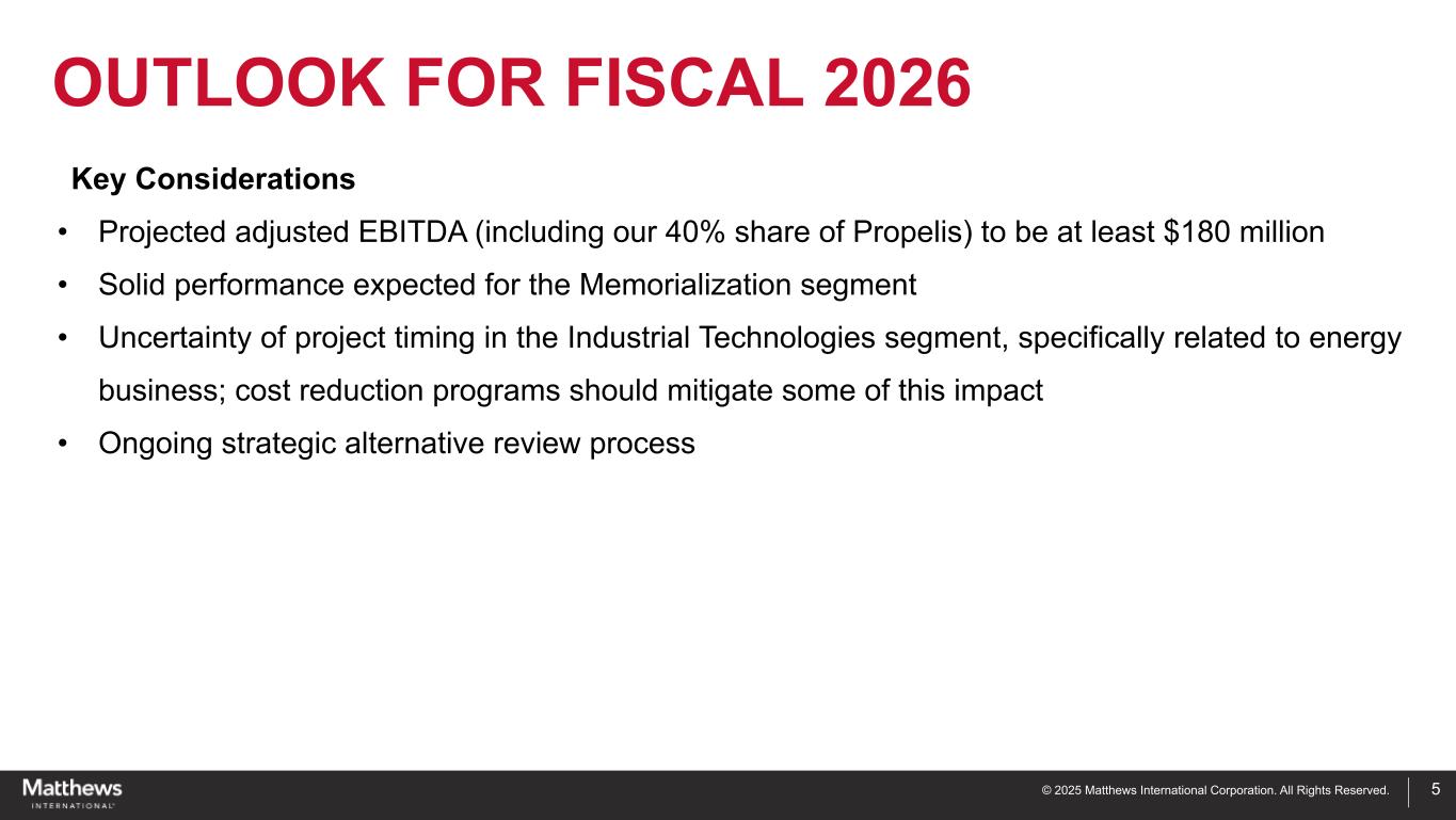 ©2025 Matthews International Corporation。版权所有。关键考虑因素•预计调整后EBITDA(包括我们在Propelis的40%份额)至少为1.8亿美元•预计纪念部门的业绩稳健•工业技术部门的项目时间不确定,特别是与能源业务相关的项目;成本削减计划应会减轻部分这种影响•正在进行的战略替代审查流程展望2026财年5