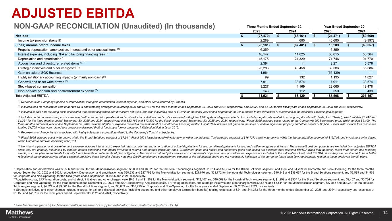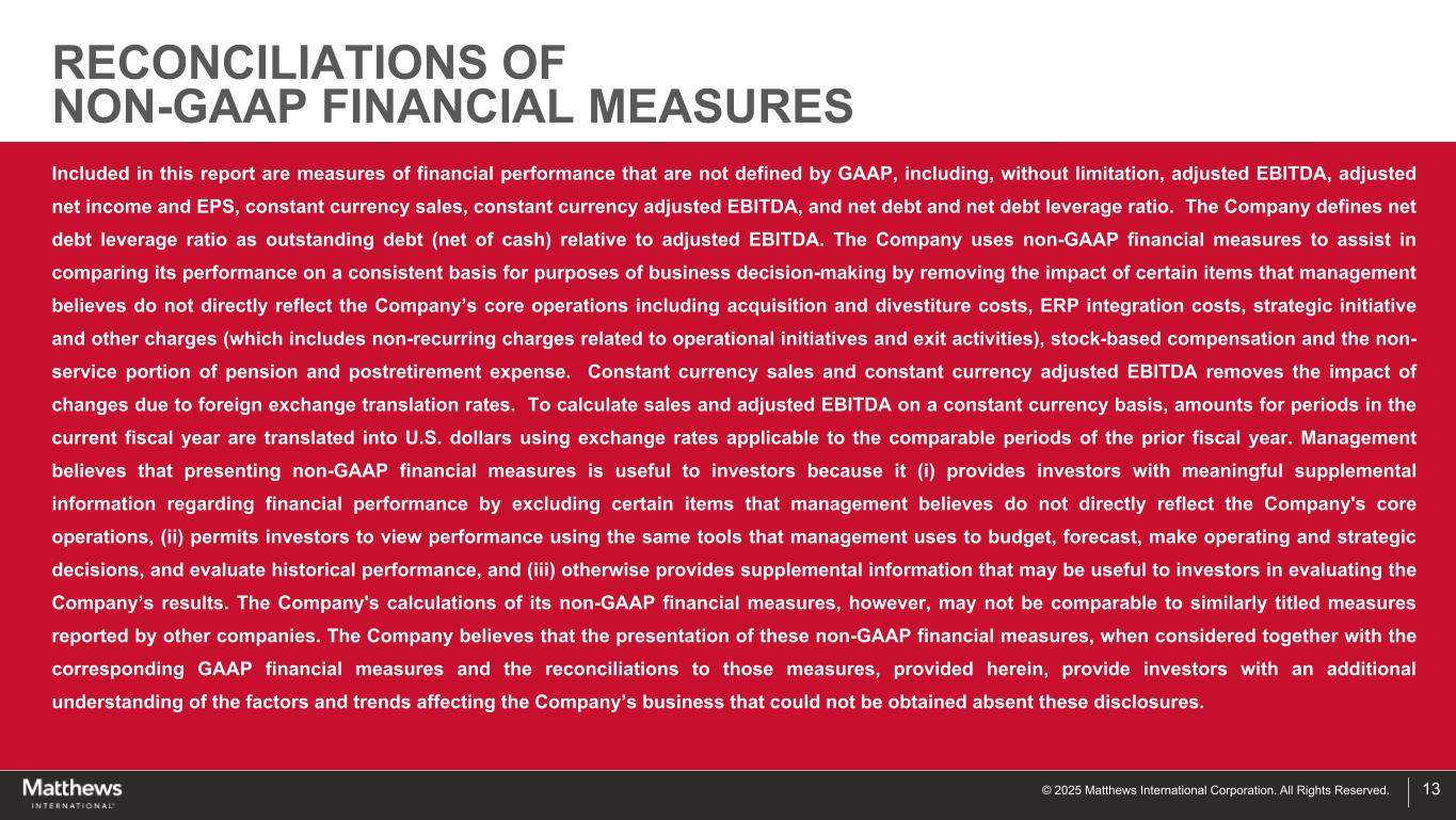 ©2025 Matthews International Corporation。版权所有。13本报告中包括未由GAAP定义的财务业绩衡量标准,包括但不限于调整后EBITDA、调整后净收入和每股收益、固定货币销售额、固定货币调整后EBITDA以及净债务和净债务杠杆率。该公司将净债务杠杆率定义为相对于调整后EBITDA的未偿债务(扣除现金)。公司使用非公认会计准则财务指标,通过去除管理层认为不直接反映公司核心业务的某些项目的影响,包括收购和剥离成本、ERP整合成本、战略举措和其他费用(其中包括与运营举措和退出活动相关的非经常性费用)、基于股票的薪酬以及养老金和退休后费用中的非服务部分,以帮助在一致的基础上比较其业绩,以供业务决策之用。不变货币销售额和不变货币调整后EBITDA消除了外汇换算率变化的影响。为了在固定货币基础上计算销售额和调整后的EBITDA,本财政年度期间的金额使用适用于上一财政年度可比期间的汇率换算成美元。管理层认为,提出非GAAP财务指标对投资者有用,因为它(i)通过排除管理层认为不能直接反映公司核心运营的某些项目,为投资者提供有关财务业绩的有意义的补充信息,(ii)允许投资者使用管理层用于预算、预测、做出运营和战略决策以及评估历史业绩的相同工具查看业绩,以及(iii)以其他方式提供可能对投资者评估公司业绩有用的补充信息。然而,该公司对其非美国通用会计准则财务指标的计算可能无法与其他公司报告的类似标题的指标进行比较。公司认为,这些非GAAP财务指标的列报,当与此处提供的相应GAAP财务指标以及与这些指标的对账一起考虑时,可以让投资者进一步了解影响公司业务的因素和趋势,而这些因素和趋势在没有这些披露的情况下是无法获得的。非公认会计原则财务措施的调节