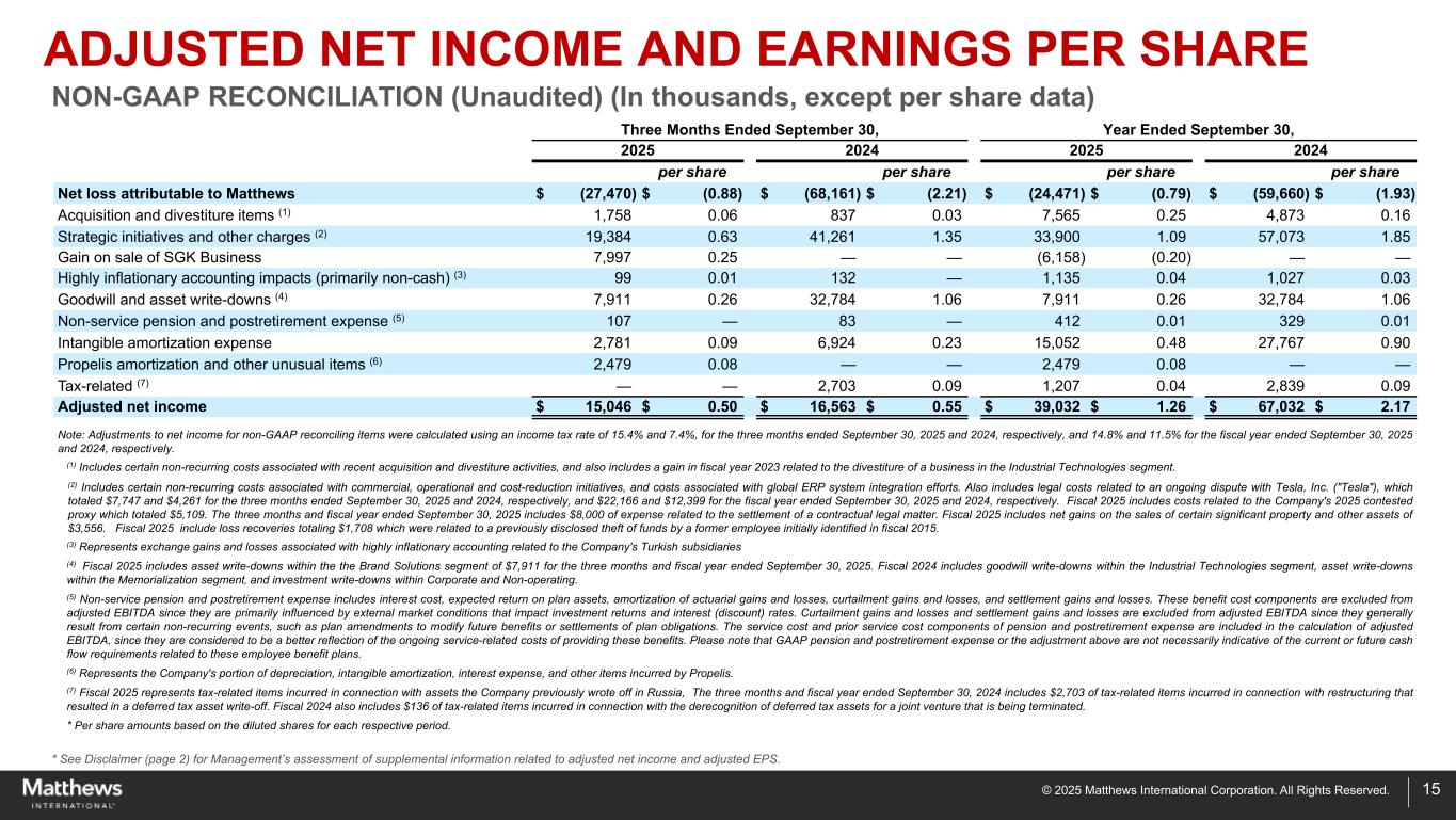 ©2025 Matthews International Corporation。版权所有。*请参阅免责声明(第2页),了解管理层对与调整后EBITDA相关的补充信息的评估。14截至9月30日止三个月、截至2025年9月30日止年度202420252024净亏损$(27,470)$(68,161)$(24,471)$(59,660)所得税拨备(利益)2,28968040,680(9,997)(亏损)所得税前收入$(25,181)$(67,481)$ 16,209 $(69,657)Propelis折旧、摊销、利息及其他不寻常项目(1)6,359 — 6,359 —利息支出,含RPA和保理融资费(2)16,14714,82566,81555,364折旧摊销*15,17524,32971,74694,770收购与剥离相关项目(三)**2,394119,2715,576战略举措和其他费用(4)**↓ 23,28348,45839,58665,586出售SGK业务的收益1,964 —(55,139)—高度通胀的会计影响(主要是非现金)(5)991321,1351,027商誉和资产减记(6)7,91133,5747,91133,574股票薪酬3,2274,16923,06518,478非服务养老金和退休后费用(7)143112550439调整后EBITDA总额51,521美元58,129美元187,508美元205,157美元(1)代表公司部分的折旧、无形摊销、利息费用以及Propelis产生的其他项目。(2)包括截至2025年9月30日和2024年9月30日止三个月根据RPA和保理安排出售的应收款项的费用,总额分别为629美元和1192美元,截至2025年9月30日和2024年9月30日止财政年度分别为3920美元和4830美元。(3)包括与最近的收购和剥离活动相关的某些非经常性成本,还包括与剥离工业技术部门的一项业务相关的截至2025年9月30日的财政年度的2072美元亏损。(4)包括与商业、运营和成本削减举措相关的某些非经常性成本,以及与全球ERP系统集成工作相关的成本。还包括与特斯拉公司(“特斯拉”)持续纠纷相关的法律费用,截至2025年9月30日和2024年9月30日止三个月的总额分别为7747美元和4261美元,截至2025年9月30日和2024年9月30日止财政年度的总额分别为22166美元和12399美元。2025财年包括与公司2025年有争议的代理权相关的费用,总计5109美元。截至2025年9月30日的三个月和财政年度包括与解决合同许可事项相关的8000美元费用。2025财年包括出售某些重要财产和其他资产的净收益3556美元。2025财年包括总额为1708美元的损失赔偿,这些损失与此前披露的一名最初在2015财年被发现的前雇员盗窃资金有关。(5)表示与公司土耳其子公司相关的高度通货膨胀会计相关的汇兑损失。(6)2025财年包括品牌解决方案部门的资产减记7911美元。2024财年包括工业技术部门的商誉减记16,727美元,纪念部门的资产减记13,716美元,公司和非经营部门的投资减记3,131美元。(7)非服务养老金和退休后费用包括利息成本、计划资产预期收益率、精算损益摊销、限电损益、结算损益。这些福利成本部分不包括在调整后的EBITDA中,因为它们主要受到影响投资回报和利率(贴现)率的外部市场条件的影响。缩减损益和结算损益不包括在调整后的EBITDA中,因为它们通常是由某些非经常性事件引起的,例如修改未来福利的计划修订或计划义务的结算。养老金和退休后费用的服务成本和先前服务成本部分包括在调整后EBITDA的计算中,因为它们被认为更能反映提供这些福利的持续服务相关成本。请注意,GAAP养老金和退休后费用或上述调整不一定表明与这些员工福利计划相关的当前或未来现金流需求。*截至2025年9月30日和2024年9月30日的三个月,纪念部分的折旧和摊销分别为8566美元和7368美元,工业技术部分的折旧和摊销分别为5063美元和6028美元,品牌解决方案部分的折旧和摊销分别为1014美元和9724美元,公司和非经营部分的折旧和摊销分别为532美元和1209美元。纪念部分折旧和摊销分别为30,332美元和27,768美元,工业技术部分为21,870美元和23,772美元,品牌解决方案部分为16,949美元和38,667美元,公司和非经营部分为2,595美元和4,563美元, 分别截至2025年9月30日和2024年9月30日的财政年度。**截至2025年9月30日和2024年9月30日的三个月,购置成本、ERP整合成本、战略举措和其他费用分别为纪念部分9611美元和1309美元,工业技术部分12407美元和40069美元,品牌解决方案部分1202美元和307美元,公司和非经营部分2457美元和6784美元。截至2025年9月30日和2024年9月30日的财政年度,购置成本、ERP整合成本、战略举措和其他费用分别为:纪念部分13876美元和3514美元,工业技术部分27868美元和54357美元,品牌解决方案部分4024美元和3001美元,公司和非经营部分3089美元和10290美元。↓战略举措和其他费用包括截至2025年9月30日和2024年9月30日止三个月的离职和处置活动(包括遣散费和其他员工解雇福利)费用总额分别为24美元和41,353美元,截至2025年9月30日和2024年9月30日止财政年度的费用分别为1,158美元和45,705美元。调整后EBITDA非公认会计原则对账(未经审计)(单位:千)