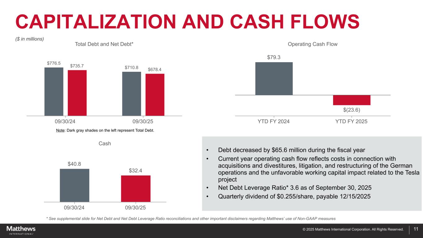 ©2025 Matthews International Corporation。版权所有。纪念*有关Matthews使用非公认会计原则措施的调整后EBITDA调节和其他重要免责声明823.0% 21.1% $ 196.8 $ 209.7 Q4 FY2024 Q4 FY2025 $ 829.7 $ 809.5 FY2024 FY2025 $ 40.5 $ 45.1 Q4 FY2024 Q4 FY2025 $ 162.6 $ 169.5 FY2024 FY2025销售额•收购道奇公司的收益和通货膨胀的价格实现•花岗岩纪念物和棺材销量下降,主要是由于美国棺材死亡人数减少调整后EBITDA •通货膨胀的价格实现和成本节约举措的好处,部分被较高的材料成本影响所抵消•收购和处置未盈利的欧洲火化设备业务20.6% 21.5% 19.6% 20.9%(百万美元)Q4销售额Q4调整后EBITDA & Margin*年初至今销售额年初至今调整后EBITDA &利润率*
