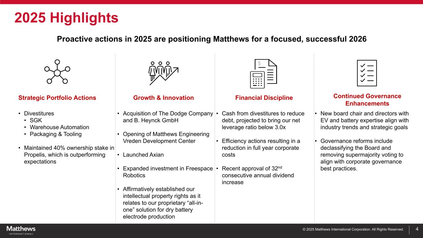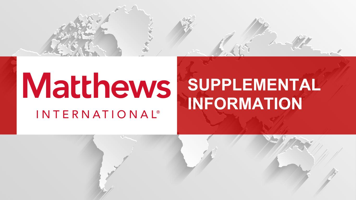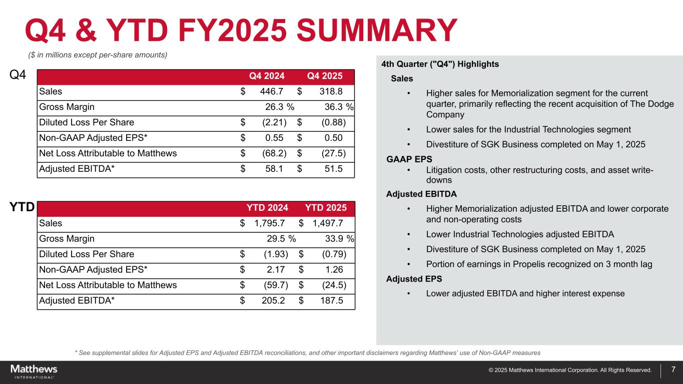 ©2025 Matthews International Corporation。版权所有。免责声明2本演示文稿中包含的任何前瞻性陈述均根据1995年《私人证券诉讼改革法案》的“安全港”条款包含在内。这些前瞻性陈述包括但不限于有关Matthews International Corporation及其合并子公司(统称“Matthews”或“公司”)对未来的预期、希望、信念、意图或战略的陈述,包括有关与Peninsula Parent LLC,d.b.a. Propelis Group(“Propelis”)的合资交易相关的预期收益和风险及其时间安排的陈述,并可通过使用“预期”、“相信”、“打算”、“项目”、“预期”、“估计”、“计划”、“寻求”、“预测”、“预测”、“目标”、“目标”、“潜力”、“前景”、“可能”、“将”等词语来识别,“可能”或这些术语的否定,其他类似术语及其变体。此类前瞻性陈述涉及已知和未知的风险和不确定性,可能导致公司未来期间的实际业绩与管理层的预期存在重大差异,因此无法保证此类预期将被证明是正确的。可能导致公司业绩与此类前瞻性陈述中讨论的结果存在重大差异的因素主要包括我们实现与Propelis于2025财年结束的合资交易的预期收益的能力面临的风险、国内或国际经济状况的变化、外币汇率的变化、利率的变化、公司产品制造中使用的材料成本的变化,包括由于关税调整导致的成本变化、商誉或无形资产的任何减值,由于环境法律法规、第三方向公司提供的电信、网络服务器维护、云计算或交易处理服务等某些服务的中断、死亡率和火化率的变化、公司经营所在行业整合导致的产品需求或定价变化,或其他因素,如供应链中断、劳动力短缺或劳动力成本增加、国内或国际竞争压力导致的产品需求或定价变化、实现成本削减目标的能力,对公司运营的环境责任和限制,与公司收购、资产剥离和业务合并相关的未知风险、网络安全问题和管理网络安全威胁所产生的成本、公司内部控制的有效性、遵守国内外法律法规、公司无法控制的技术因素、流行病或类似疫情的影响,或对我们的行业、客户或供应链的其他干扰、全球冲突的影响,例如当前俄罗斯和乌克兰之间的战争、公司对其探索的计划和预期,以及与其业务组合相关的各种战略的预期执行,公司对董事会的计划和期望,以及公司在10-K表格年度报告和向美国证券交易委员会提交的其他定期文件中描述的其他因素。本报告包括美国公认会计原则(“GAAP”)未定义的财务业绩衡量标准。公司使用非公认会计准则财务指标,通过去除管理层认为不直接反映公司核心业务的某些项目的影响,包括收购和剥离成本、ERP整合成本、战略举措和其他费用(其中包括与某些商业和运营举措以及退出活动相关的非经常性费用)、基于股票的薪酬以及养老金和退休后费用的非服务部分,以帮助在一致的基础上比较其业绩,以供业务决策之用。管理层认为,提出非公认会计准则财务指标对投资者有用,因为它(i)通过排除管理层认为不能直接反映公司核心运营的某些项目,为投资者提供有关财务业绩的有意义的补充信息,(ii)允许投资者使用管理层用于预算、预测、做出运营和战略决策以及评估历史业绩的相同工具查看业绩,以及(iii)以其他方式提供可能对投资者评估公司业绩有用的补充信息。该公司认为,这些非公认会计准则财务指标的列报, 当与相应的GAAP财务指标以及与这些指标的对账一起考虑时,这里提供的,让投资者进一步了解影响公司业务的因素和趋势,而这些因素和趋势在没有这些披露的情况下是无法获得的。公司认为,经调整EBITDA提供了相关和有用的信息,公司管理层在评估其业务表现时使用了这些信息。公司将调整后EBITDA定义为未计利息、所得税、折旧、摊销和某些非现金和/或非经常性项目的收益,这些项目对管理层对其经营业绩的评估没有直接贡献。这些项目包括基于股票的薪酬、养老金和退休后费用的非服务部分、收购和剥离成本、ERP整合成本以及战略举措和其他费用。调整后的EBITDA为公司提供了对扣除投融资费用和所得税影响前的收益,以及某些收购和剥离以及ERP整合成本的影响,以及不反映公司运营的普通收益的项目的理解。这一衡量标准可能对投资者评估经营业绩有用。它还可以作为贷款人的财务衡量标准,并被公司管理层用来衡量经营业绩。调整后EBITDA不是衡量GAAP下公司财务业绩的指标,不应被视为替代净收入或根据GAAP得出的其他业绩指标,或作为衡量公司流动性的经营活动现金流的替代指标。该公司对调整后EBITDA的定义可能无法与其他公司使用的类似标题的衡量标准进行比较。公司提出了固定货币销售额和固定货币调整后EBITDA,并认为这些措施提供了相关和有用的信息,公司管理层通过去除外汇换算率导致的变化影响,在一致的基础上评估其业务表现时使用了这些信息。这些措施允许管理层以及投资者在固定货币基础上评估公司的销售额和调整后的EBITDA。该公司还提出了调整后的净收入和调整后的每股收益,并认为每一项衡量标准都提供了相关和有用的信息,这些信息被分析师和投资者以及公司管理层广泛用于评估其业务表现。调整后的净收入和调整后的每股收益通过排除某些收购、剥离和系统集成成本的影响,以及不反映我们运营的普通收益的项目,使公司了解我们业务的主要运营结果。这些措施为管理层提供了对股东收益价值