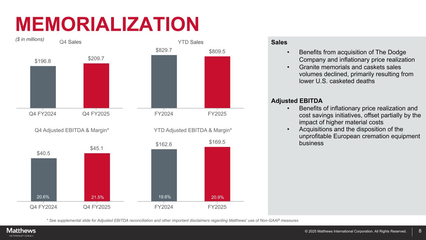 ©2025 Matthews International Corporation。版权所有。Q4 & YTD FY2025总结*请参阅调整后每股收益和调整后EBITDA对账的补充幻灯片,以及有关Matthews使用非GAAP衡量标准的其他重要免责声明第4季度(“Q4”)突出了销售额•本季度纪念部门的销售额增加,主要反映了最近对道奇公司的收购•工业技术部门的销售额下降• SGK业务的剥离于2025年5月1日完成GAAP EPS •诉讼成本、其他重组成本,和资产减记调整后EBITDA •更高的备忘录调整后EBITDA和更低的公司和非经营成本•更低的工业技术调整后EBITDA • SGK业务的剥离已于5月1日完成,2025年•按滞后3个月确认的Propelis部分收益调整后每股收益•调整后EBITDA较低和更高的利息支出7 Q4 2024 Q4 2025销售额$ 446.7 $ 318.8毛利率26.3% 36.3%稀释每股亏损$(2.21)$(0.88)Non-GAAP调整后EPS*$ 0.55 $ 0.50归属于马修斯的净亏损$(68.2)$(27.5)调整后EBITDA*58.1美元51.5美元(百万美元每股金额除外)Q4 YTD YTD 2024 YTD 2025销售额$ 1,795.7 $ 1,497.7毛利率29.5% 33.9%摊薄每股亏损$(1.93)$(0.79)Non-GAAP调整后EPS*$ 2.17 $ 1.26归属于Matthews的净亏损$(59.7)$(24.5)调整后EBITDA*$ 205.2 $ 187.5