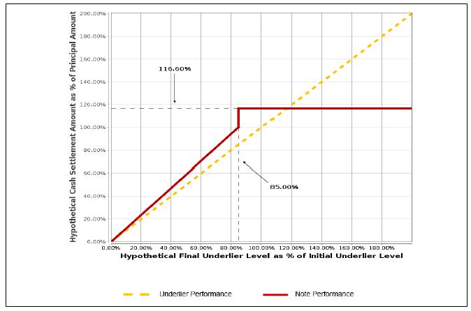 票据不计息。您将在规定的到期日(2027年4月14日,可能会进行调整)就票据支付的金额是基于标普 500的表现®指数(“标的物”)自交易日至确定日(2027年4月12日,可调整)计量。如果在确定日期的最终基础水平大于或等于初始基础水平的85.00%(5670.97,这是交易日期基础水平的收盘水平),您将收到最高结算金额(票据每1000美元本金为1166.00美元)。如果最终的基础水平从最初的基础水平下跌超过15.00%,你的票据的回报将是负数。你可能会失去对票据的全部投资。