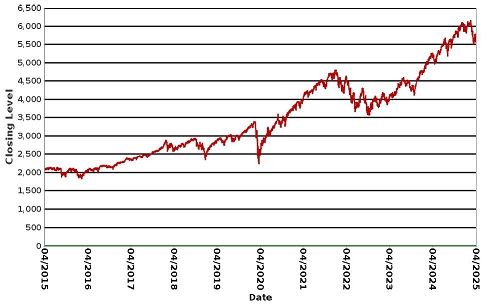 下图显示了2015年4月2日至2025年4月2日期间标的的每日历史收盘水平。2025年4月2日,标的收盘水平为5670.97。我们从彭博金融服务公司获得了下图中的收盘水平,未经独立验证。