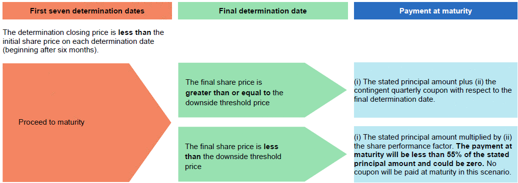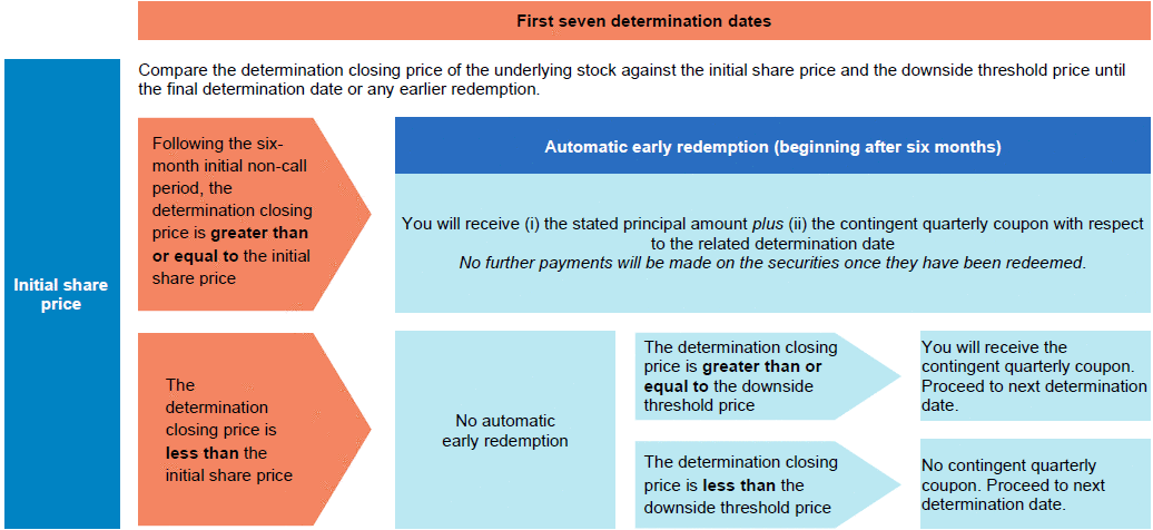 证券在原定发行日期后六个月内不得提前赎回。在这六个月的非赎回期之后,如果在2024年4月29日开始的任何确定日,标的股票的确定收盘价高于或等于初始股价,则证券将在相关确定日之后的第三个工作日自动赎回,以获得提前赎回付款,如下文“确定日、或有付款日和提前赎回日”中所述。证券一旦赎回,将不再支付任何款项。 |