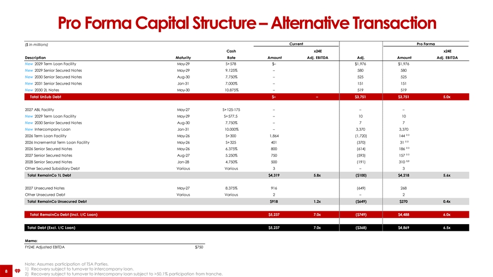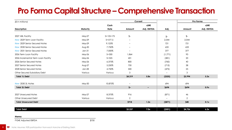 备考资本Structure –另类交易当前备考(百万美元)现金x24E x24E说明到期利率金额调整后EBITDA调整后金额EBITDA新2029年定期贷款融资5月29日S + 578 $ – $ 1,976 $ 1,976新2029年优先有担保票据5月29日9.125% – 580580新2030年优先有担保票据Aug-30 7.750% – 525525新2031年优先有担保票据JA-31 7.000% – 151151新2030年2L票据May-30 10.875% – 519519总UnSub债务$ – – $ 3,751 $ 3,751 5.0x 2027 ABL融资5月27日S + 125-175 – ––新2029年定期贷款融资5月29日S + 577.5 – 1010新的2030优先有担保票据Aug-30 7.750% – 77新的公司间贷款Jan-31 10.000% – 3,3703,3702026定期贷款融资May-26 S + 3001,864(1,720)144 Sext 2026增量定期贷款融资May-26 S + 325401(370)31 Sext 2026优先有担保票据May-26 6.375% 800(614)186 Sext 2027优先有担保票据Aug-27 5.250% 750(593)157 sext 2028优先有担保票据Jan-28 4.750% 500(191)310 ²其他有担保附属债务各种3 – 3合计剩余Co 1L债务$ 4,319 5.8x($ 100)$ 4,218 5.6x 2027无担保票据May-27 8.375% 916(649)268其他无RemainCo无担保债务总额918美元1.2x(649美元)270美元0.4x RemainCo债务总额(包括I/C贷款)5,237美元7.0x(749美元)4,488美元6.0x总债务(不含I/C贷款)5,237美元7.0x(368美元)4,869美元6.5x备忘录:FY24E调整后EBITDA 750美元注:假设TSA缔约方参与。1)回收受制于周转至公司间贷款。8 2)回收受制于营业额到公司间贷款受制于> 50.1%的参与从批次。