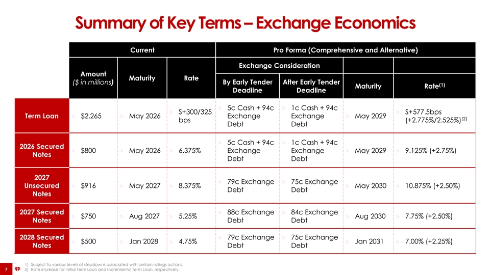 关键术语摘要– Exchange Economics Current Pro Forma(综合和替代方案)交换对价金额到期利率(百万美元)提前投标后提前投标(1)到期利率截止期限> 5c现金+ 94c > 1c现金+ 94c > S + 300/325 > S + 577.5bps定期贷款> $ 2,265 > 2026年5月交换> 2029年5月(2)bps(+ 2.775%/2.525%)债务债务> 5c现金+ 94c > 1c现金+ 94c 2026有担保> 800美元> 2026年5月> 6.375%交换> 2029年5月> 9.125%(+ 2.75%)票据债务债务2027 > 79c交换> 75c交换无担保> 916美元> 2027年5月> 8.375% > 2030年5月> 10.875%(+ 2.50%)债务债务票据2027有担保> 88c交换> 84c交换> 750美元> 2027年8月> 5.25% > 2030年8月> 7.75%(+ 2.50%)票据债务债务2028有担保> 79c交换> 75c交换> 500美元> 2028年1月> 4.75% > 2031年1月> 7.00%(+ 2.25%)票据债务债务1)受制于与某些评级行动相关的不同程度的降级。72)首期定期贷款和增量定期贷款分别加息。