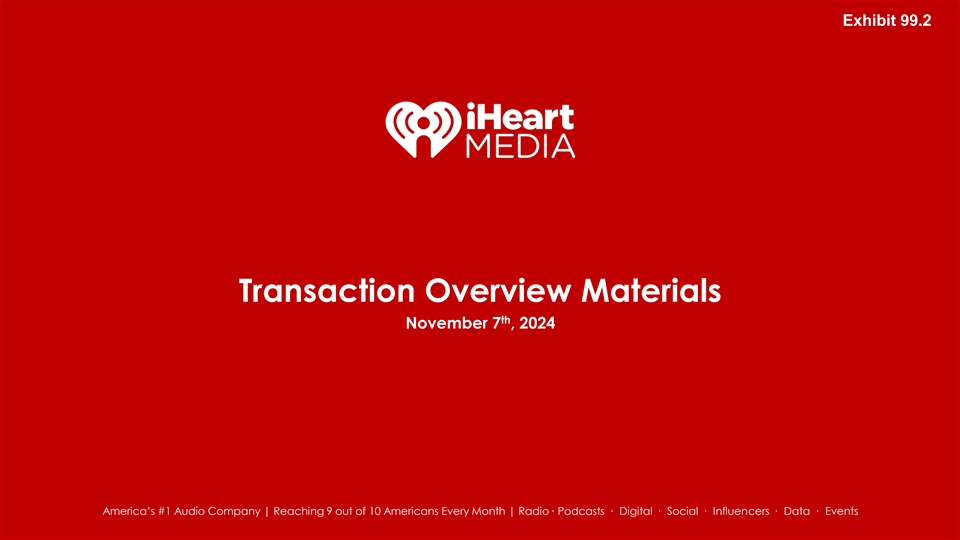 附件 99.2交易概览材料th 2024年11月7日美国排名第一的音频公司|每月达到10个美国人中的9个| Radio ∙ Podcasts ∙ digital ∙ social ∙ influencers ∙ data ∙ events