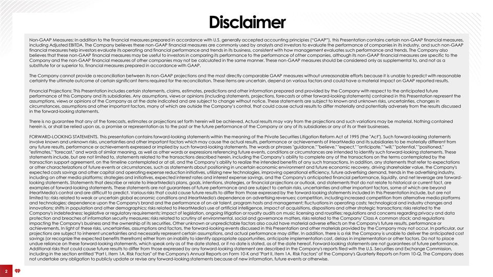 免责声明非GAAP措施:除了根据美国公认会计原则(“GAAP”)编制的财务措施外,本演示文稿还包含某些非GAAP财务措施,包括调整后的EBITDA。该公司认为,分析师和投资者通常使用这些非GAAP财务指标来评估所在行业公司的业绩,而这些非GAAP财务指标有助于投资者评估其运营和财务业绩以及业务趋势,与管理层评估此类业绩和趋势的方式一致。该公司还认为,这些非美国通用会计准则财务指标可能有助于投资者将其业绩与其他公司的业绩进行比较,尽管其非美国通用会计准则财务指标是公司特有的,其他公司的非美国通用会计准则财务指标可能不会以相同的方式计算。这些非公认会计原则措施应仅被视为对根据公认会计原则编制的财务措施的补充,而不是替代或优于这些措施。该公司无法在没有不合理努力的情况下提供其非公认会计原则预测与最直接可比的公认会计原则措施之间的对账,因为它无法合理确定地预测对账所需的某些重要项目的最终结果。这些项目是不确定的,取决于各种因素,可能会对GAAP报告结果产生重大影响。财务预测:本演示文稿包括公司就本公司及其子公司的预期未来业绩编制和提供的某些陈述、索赔、估计、预测和其他信息。本演示文稿中包含的任何假设、观点或意见(包括陈述、预测、预测或其他前瞻性陈述)均代表公司在所示日期的假设、观点或意见,如有更改,恕不另行通知。这些陈述受已知和未知风险、不确定性、环境变化、假设和其他重要因素的影响,其中许多因素超出了公司的控制范围,可能导致实际结果与前瞻性陈述中讨论的结果存在重大差异,并可能产生不利影响。无法保证本文所述的任何预测、估计或预测都将实现。实际结果可能与预测不同,这种变化可能是重大的。本文所载的任何内容均不是或不应被视为关于公司或其任何子公司或其任何业务的过去或未来业绩的承诺或陈述。前瞻性陈述。本演示文稿包含1995年《私人证券诉讼改革法案》(法案)含义内的前瞻性陈述。此类前瞻性陈述涉及已知和未知的风险、不确定性和其他重要因素,可能导致iHeartMedia及其子公司的实际结果、业绩或成就与此类前瞻性陈述明示或暗示的任何未来结果、业绩或成就存在重大差异。指导、相信、预期、预期、将、潜在、定位、估计、预测和类似含义的词语,以及引用未来事件、条件或情况的其他词语或表达,旨在识别此类前瞻性陈述。这些陈述包括但不限于与本文所述交易相关的陈述,包括公司按照交易支持协议所设想的条款、在所设想的时间表上或根本没有完成任何交易的能力,以及公司实现任何此类交易的预期收益的能力。此外,任何提及对未来事件或情况的预期或其他特征的陈述,例如关于在不确定的经济环境和未来经济复苏中的定位、推动股东价值、公司预期的成本节约和其他资本和运营费用削减举措、利用新技术、提高运营效率、未来广告需求、广告行业趋势,包括在其他媒体平台上的趋势的陈述;战略和举措、预期利率和利息费用节约,以及公司预期的财务业绩、流动性和净杠杆的陈述均为前瞻性陈述。描述或涉及iHeartMedia的计划、目标、意图、战略或财务预测或前景的陈述,以及与历史或当前事实无关的陈述,均为前瞻性陈述的示例。这些报表不是对未来业绩的保证,受到一定的风险、不确定性和其他重要因素的影响, 其中有些超出了iHeartMedia的控制范围,也很难预测。可能导致未来结果与本演示文稿中包含的前瞻性陈述所表达的结果不同的各种风险包括但不限于:与疲软或不确定的全球经济状况以及iHeartMedia对广告收入的依赖相关的风险;竞争,包括来自替代媒体平台和技术的竞争加剧;对公司品牌以及直播人才、节目主持人和管理层表现的依赖;运营成本波动;技术和行业变革与创新;人口和其他人口结构的变化;与iHeartMedia使用人工智能相关的风险、收购的影响,处置和其他战略交易;与公司债务相关的风险;立法或监管要求;立法、正在进行的诉讼或版税审计对音乐许可和版税的影响;有关隐私和数据保护以及违反信息安全措施的法规和担忧;与环境、社会和治理事项的审查相关的风险,与公司A类普通股相关的风险;以及影响公司业务及其证券所有权的法规。其他未知或不可预测的因素也可能对公司未来的业绩、业绩或成就产生重大不利影响。鉴于这些风险、不确定性、假设和因素,本演示文稿和公司提供的其他材料中讨论的前瞻性事件可能不会发生。特别是,我们的预测受到固有不确定性的影响,必然代表某些假设,实际表现可能有所不同。此外,由于无法识别适当机会、预测实施成本、实施延迟或其他因素,公司存在无法实现预期成本节约(或确认由此带来的预期收益)的风险。不要过分依赖这些前瞻性陈述,这些陈述仅代表所述日期,或者如果没有说明日期,则截至本文所述日期。前瞻性陈述并非对未来业绩的保证。可能导致未来结果与任何前瞻性陈述所表达的结果不同的其他风险在公司提交给美国证券交易委员会的报告中进行了描述,包括标题为第一部分第1A项的部分。公司年报10-K表格及第II部分第1A项的风险因素。表格10-Q的公司季度报告的风险因素。公司不承担因新信息、未来事件或其他原因而公开更新或修改任何前瞻性陈述的任何义务。22