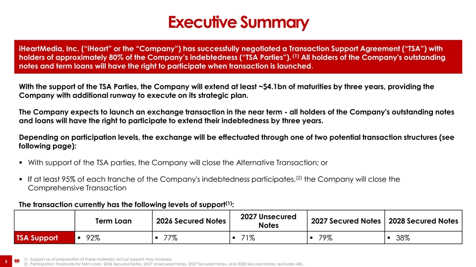 执行摘要iHeartMedia,Inc.(“iHeart”或“公司”)已与(1)公司约80%债务的持有人(“TSA方”)成功谈判达成交易支持协议(“TSA”)。当交易启动时,公司未偿还票据和定期贷款的所有持有人将有权参与。在TSA各方的支持下,该公司将把至少约41亿美元的到期日延长三年,为公司执行战略计划提供了额外的跑道。公司预计将在近期推出交换交易——公司未偿还票据和贷款的所有持有人将有权参与将其债务延长三年。根据参与程度的不同,交易所将通过以下两种潜在交易结构中的一种(见下页)来实现:▪在TSA各方的支持下,公司将完成替代交易;或(2)▪如果公司每一档债务至少有95%参与,公司将完成综合交易(1)该交易目前有以下几个级别的支持:2027年无抵押定期贷款2026年有担保票据2027年有担保票据2028年有担保票据票据TSA支持▪92%▪77%▪71%▪79%▪38% 1)截至准备这些材料时的支持;实际支持可能会增加。32)定期贷款、2026年有担保票据、2027年无担保票据、2027年有担保票据、2028年有担保票据的参与门槛;不包括ABL。