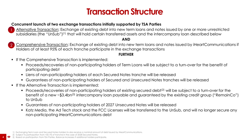 交易Structure同时推出两项最初由TSA各方支持的交易所交易▪替代交易:将现有债务交换为新的定期贷款及由一间或多于一间将持有若干转让资产的非限制性1(1)附属公司(“UnSub”)发行的票据及下文所述的公司间贷款及▪综合交易:将现有债务交换为iHeartCommunications发行的新定期贷款及票据如果每档至少95%的2个持有人进一步参与交易所交易▪如综合交易得以实施:▪定期贷款非参与持有人的收益/回收将为参与债务的利益进行周转▪各有担保票据批次的非参与持有人的留置权将被解除▪有担保的非参与持有人的担保和无抵押票据部分将被释放▪如果实施替代交易:(2)▪现有担保债务的非参与持有人的收益/追偿将根据现有信贷集团(“RemainCo”)向UNSub支付和担保的新的约34亿美元公司间贷款的(3)利益进行周转▪2027年无抵押票据非参与持有人担保解除▪Katz Media,Ad Tech堆栈和FCC许可证将被转移到UNSub,并将不再担保任何非参与的iHeartCommunications债务1)交换定期贷款和担保票据持有人也将获得iHeartCommunications发行的名义金额的债务。2)在2028年有担保票据的情况下,须从> 50.1%的批次参与。43)基于TSA缔约方的参与。如果有更多的持有者参与,余额就会增加。