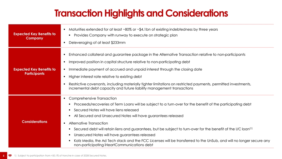 交易要点和注意事项▪现有债务中至少~80%或~41亿美元的到期期限延长三年预计关键收益将▪为公司提供执行战略计划的跑道公司▪去杠杆化至少233mm美元▪替代交易中相对于非参与者的增强担保物和担保包▪资本结构相对于非参与债务的地位得到改善预期关键收益▪即时支付截至收盘日的应计未付利息参与者▪相对于现有债务的利率更高▪限制性契约,包括对限制性付款的实质性更严格限制,允许的投资、增量债务能力和未来负债管理交易▪综合交易▪定期贷款的收益/回收将为参与债务的利益进行周转▪有担保票据将有留置权解除▪所有有担保和无担保票据将有担保解除对价▪另类交易(1)▪有担保债务将保留留置权和担保,但要为I/C贷款的利益进行周转▪无担保票据将有担保解除▪Katz Media,Ad Tech堆栈和FCC许可证将被转移到UNSub,并且将不再担保任何非参与的iHeartCommunications债务51),但须在2028年有担保票据的情况下从> 50.1%的批次参与。