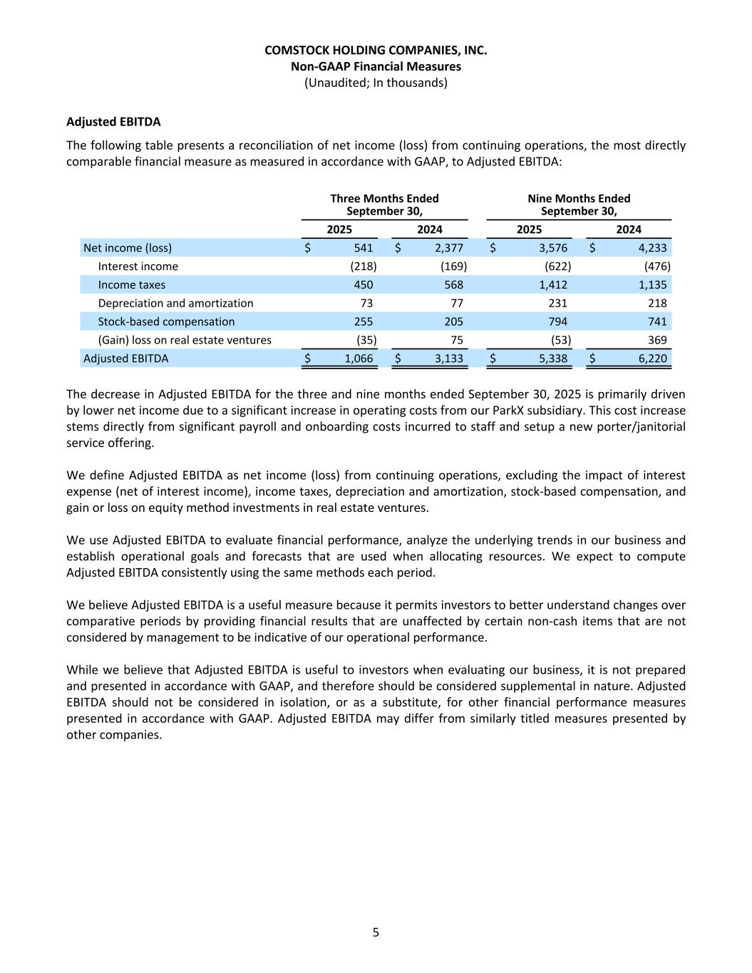 调整后EBITDA下表列出了持续经营业务的净收入(亏损)(根据公认会计原则计量的最直接可比财务指标)与调整后EBITDA的对账:截至9月30日的三个月,截至9月30日的九个月,2025202420252024净收入(亏损)541美元2,377美元3,576美元4,233美元利息收入(218)(169)(622)(476)所得税4505681,4121,135折旧和摊销7377231218股票补偿255205794741(收益)房地产企业亏损(35)75(53)369调整后EBITDA 1,066美元3,133美元5,338美元6,220截至2025年9月30日止三个月和九个月的调整后EBITDA减少主要是由于我们的ParkX子公司的运营成本显着增加导致净收入减少。这种成本增加直接源于员工和设置新的搬运工/清洁服务产品所产生的大量工资和入职成本。我们将调整后EBITDA定义为来自持续经营业务的净收入(亏损),不包括利息费用(扣除利息收入)、所得税、折旧和摊销、基于股票的补偿以及对房地产企业的权益法投资的损益的影响。我们使用调整后的EBITDA来评估财务业绩,分析我们业务的基本趋势,并建立在分配资源时使用的运营目标和预测。我们预计每期将使用相同的方法一致地计算调整后EBITDA。我们认为调整后的EBITDA是一个有用的衡量标准,因为它允许投资者通过提供不受管理层认为不代表我们运营业绩的某些非现金项目影响的财务业绩,更好地了解比较期间的变化。虽然我们认为调整后的EBITDA在评估我们的业务时对投资者有用,但它不是按照公认会计原则编制和列报的,因此应该被视为补充性的。不应孤立地考虑调整后的EBITDA,也不应将其作为根据公认会计原则提出的其他财务业绩衡量标准的替代品。调整后的EBITDA可能与其他公司提出的类似标题的衡量标准不同。Comstock Holding Companies, Inc.非GAAP财务指标(未经审计;单位:千)5