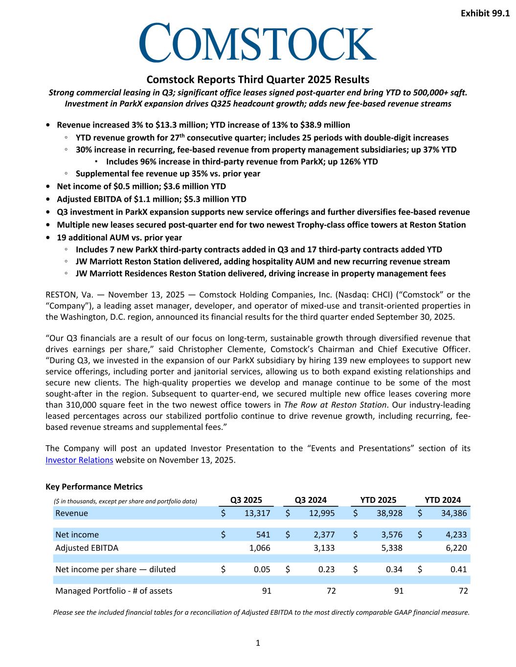 Comstock报告2025年第三季度业绩第三季度商业租赁强劲;季度末签署的重要办公室租赁使年初至今达到50万+平方英尺。对ParkX扩张的投资推动Q325员工人数增长;增加新的收费收入流•收入增长3%至1330万美元;年初至今增长13%至3890万美元丨年初至今收入连续第27个季度增长;包括25个两位数增长的时期⑤经常性增长30%,物业管理子公司收费收入;年初至今增长37%▪包括来自ParkX的第三方收入增长96%;年初至今增长126% ⑤补充费收入较上年增长35% •净收入50万美元;年初至今360万美元•调整后EBITDA为110万美元;年初至今530万美元•第三季度对ParkX扩张的投资支持新的服务产品并进一步使收费收入多样化•雷斯顿站两座最新的奖杯级办公大楼在季度末获得多个新租约•与上年相比增加19个AUM ⑤包括第三季度新增的7个ParkX第三方合同年初至今增加了17份第三方合同⑤ 纳斯达克:CHCI)(“Comstock”或“公司”)是华盛顿特区领先的混合用途和公交导向型物业资产管理公司、开发商和运营商,该公司公布了截至2025年9月30日的第三季度财务业绩。康斯托克董事长兼首席执行官Christopher Clemente表示:“我们第三季度的财务状况是我们通过推动每股收益的多元化收入关注长期、可持续增长的结果。”“在第三季度,我们投资于ParkX子公司的扩张,雇佣了139名新员工来支持新的服务产品,包括搬运工和清洁服务,这使我们既能扩展现有关系,又能获得新客户。我们开发和管理的优质物业仍然是该地区最受追捧的一些。在季度末之后,我们在Reston Station Row的两座最新办公大楼中获得了多个新的办公室租约,占地超过310,000平方英尺。我们稳定的投资组合中行业领先的租赁百分比继续推动收入增长,包括经常性、收费收入流和补充费用。”公司将于2025年11月13日在其投资者关系网站的“活动和演示”部分发布更新的投资者演示文稿。关键绩效指标(以千美元计,每股和投资组合数据除外)2025年第三季度2024年第三季度年初至今2025年年初至今2024年收入13,317美元12,995美元38,928美元34,386美元净收入541美元2,377美元3,576美元4,233美元调整后EBITDA 1,0663,1335,3386,220每股净收益—稀释后0.05美元0.23美元0.34美元0.41美元管理投资组合-#资产91729172请参阅随附的财务表格,了解调整后EBITDA与最直接可比的GAAP财务指标的对账情况。1 附件 99.1