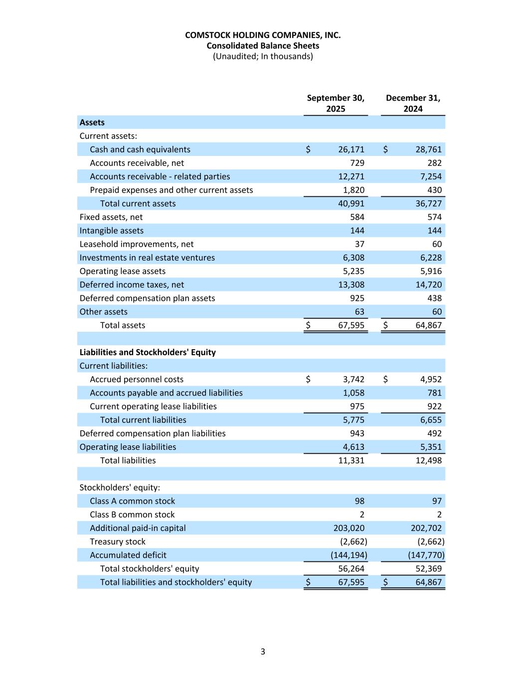 2025年9月30日、12月31日2024年资产流动资产:现金及现金等价物26,171美元28,761美元应收账款净额729282应收账款-关联方12,2717,254预付费用和其他流动资产1,820430流动资产总额40,99136,727固定资产净额584574无形资产144144租赁物改良净额3760房地产企业投资6,3086,228经营租赁资产5,2355,916递延所得税,净额13,30814,720递延补偿计划资产925438其他资产6360总资产67,595美元64,867美元负债和股东权益流动负债:应计人员费用3,742美元4,952美元应付账款和应计负债1,058781流动经营租赁负债975922流动负债总额5,7756,655递延补偿计划负债943492经营租赁负债4,6135,351负债总额11,33112,498股东权益:A类普通股9897 B类普通股22 额外实收资本 203,020202,702库存股(2,662)(2,662)累计赤字(144,194)(147,770)股东权益总额56,26452,369负债和股东权益总额67,595美元64,867美元COMSTOCK HOLDING COMPANIES,INC。合并资产负债表(未经审计;单位:千)3