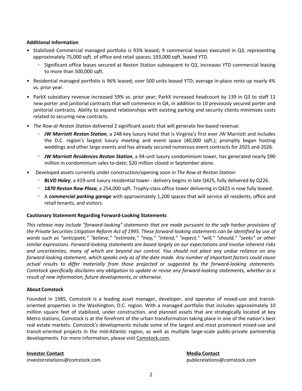 附加信息•稳定的商业管理组合93%已出租;第三季度执行9项商业租赁,代表约7.5万平方英尺的办公和零售空间;年初至今已出租19.3万平方英尺。⑤ Q3后在雷斯顿站获得的重要办公室租约,将年初至今的商业租赁增加到超过50万平方英尺。•住宅管理组合96%已出租;年初至今已出租超500套;平均就地租金较上年增长近4%。• ParkX子公司收入较上年增长59%;ParkX在第三季度增加了139名员工,为其配备了12份新的搬运工和清洁工合同,这些合同将于第四季度开始,此外还有10份先前获得的搬运工和清洁工合同。扩展与现有停车和安全客户关系的Ability可最大限度地降低与获得新合同相关的成本。• The Row at Reston Station交付了2项将产生收费收入的重要资产:④ JW万豪酒店 Reston Station,这是一家拥有248间客房的豪华酒店,是弗吉尼亚州有史以来第一家万豪酒店的TERM3TERM3,包括华盛顿地区最大的豪华会议和活动空间(40,000平方英尺);迅速开始举办婚礼和其他大型活动,并已经获得了2025年和2026年的众多活动合同。⑤ JW万豪酒店 Residences Reston Station是一座拥有94个单元的豪华公寓塔楼,迄今为止已产生近9000万美元的公寓销售额;仅在9月份就完成了2000万美元的销售额。•已开发资产目前正在建设/即将在Reston Station Row开业:⑤ BLVD Haley,一座拥有419个单元的豪华住宅塔楼-将于Q425后期开始交付,将于Q226全面交付。⑤ 1870 Reston Row Plaza,25.4万平方英尺。Q425交付的奖杯级办公大楼现已全部出租。⑤一个拥有约1,200个车位的商业停车场,将为所有居民、办公室和零售租户以及访客提供服务。关于前瞻性陈述的警示性声明本新闻稿可能包括根据1995年《私人证券诉讼改革法案》的安全港条款作出的“前瞻性”陈述。这些前瞻性陈述可以通过使用诸如“预期”、“相信”、“估计”、“可能”、“打算”、“预期”、“将”、“应该”、“寻求”或其他类似表达等词语来识别。前瞻性陈述主要基于我们的预期,涉及固有的风险和不确定性,其中许多是我们无法控制的。你不应该过分依赖任何前瞻性陈述,这些陈述仅代表作出的日期。任何数量的重要因素都可能导致实际结果与前瞻性陈述预测或建议的结果存在重大差异。Comstock明确表示不承担任何更新或修改任何前瞻性陈述的义务,无论是由于新信息、未来发展或其他原因。关于Comstock Comstock成立于1985年,是华盛顿特区地区领先的混合用途和公交导向物业的资产管理公司、开发商和运营商。康斯托克拥有一个管理投资组合,其中包括约1000万平方英尺的稳定、在建和规划资产,这些资产战略性地位于关键的地铁站,康斯托克处于全国最好的房地产市场之一发生的城市转型的最前沿。康斯托克的发展包括大西洋中部地区一些最大和最突出的混合用途和面向交通的项目,以及多个大型公私伙伴关系发展。欲了解更多信息,请访问Comstock.com。投资者联系媒体联系人investorrelations@comstock.com publicrelations@comstock.com 2