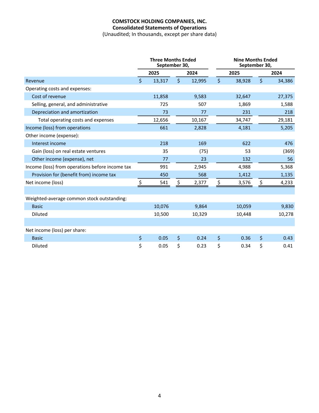 截至9月30日止三个月截至9月30日止九个月202420252024收入$ 13,317 $ 12,995 $ 38,928 $ 34,386营业成本及开支:收入成本11,8589,58332,64727,375销售、一般及行政7255071,8691,588折旧及摊销7377231218营业总成本及开支12,65610,16734,74729,181营业收入(亏损)6612,8284,1815,205其他收入(费用):利息收入218169622476房地产企业收益(亏损)35(75)53(369)其他收入(费用),净额772313256所得税前营业收入(亏损)9912,9454,9885,368所得税拨备(受益)4505681,4121,135净收入(亏损)541美元2,377美元3,576美元4,233美元加权平均已发行普通股:基本10,0769,86410,0599,830稀释后10,50010,32910,44810,278每股净收益(亏损):基本0.05美元0.24美元0.36美元0.43美元稀释后0.05美元0.23美元0.34美元0.41美元COMSTOCK HOLDING COMPANIES,INC。合并经营报表(未经审计;单位:千,每股数据除外)4