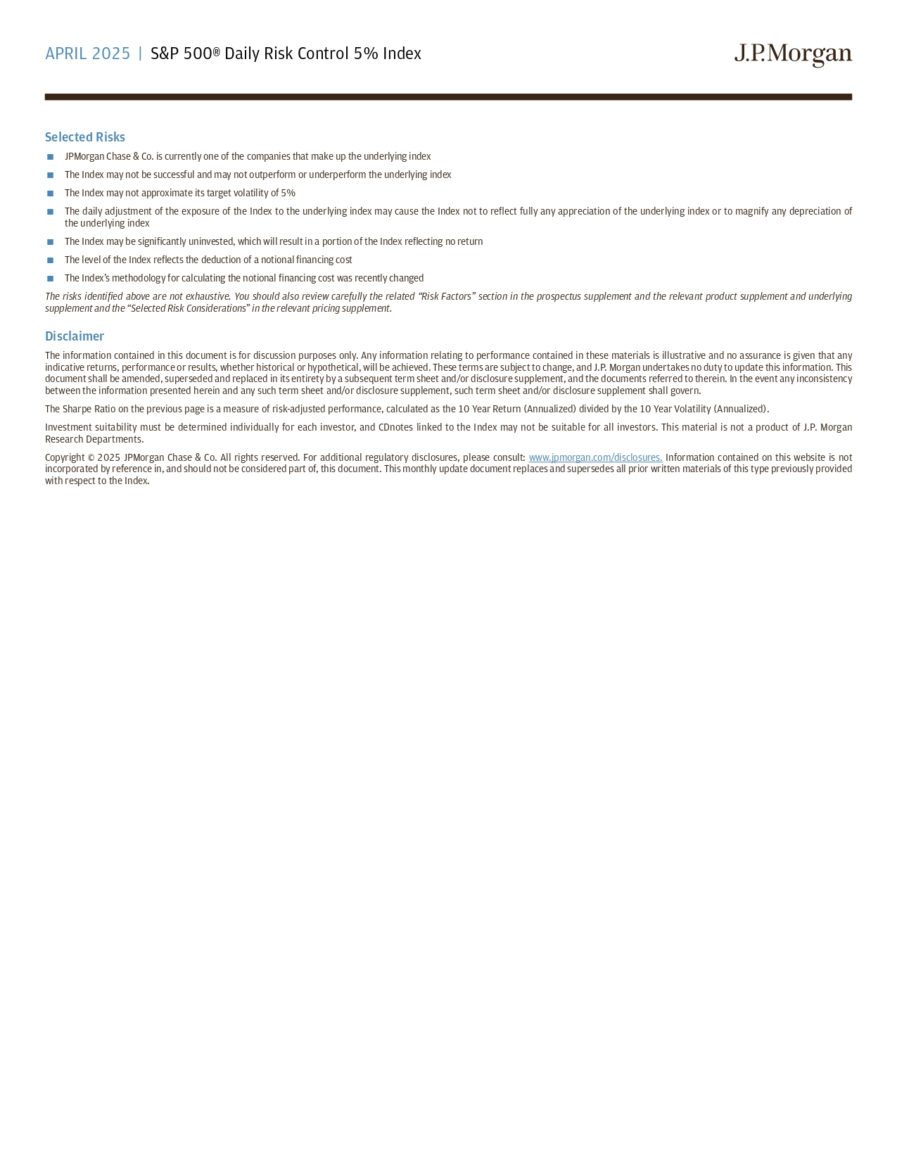 2025年4月| 标普 500®每日风控5%指数精选风险摩根大通公司是目前公司之一构成标的指数的指数可能不会成功,也可能不会跑赢或跑输标的指数指数可能不会接近其5%的目标波动率每日调整指数对标的指数的敞口可能会导致该指数不能充分反映标的指数的任何升值或放大标的指数的任何贬值,该指数可能会显着未投资,这将导致部分指数反映没有回报该指数的水平反映了扣除名义融资成本该指数计算名义融资成本的方法最近发生了变化上述确定的风险并不是详尽无遗的。还应仔细查阅招股说明书补充说明书中的相关“风险因素”部分和相关产品补充和底层补充以及相关定价补充说明书中的“精选风险考虑因素”。免责声明本文件所载信息仅供讨论之用。这些材料中包含的与业绩有关的任何信息都是说明性的,不保证将实现任何指示性回报、业绩或结果,无论是历史的还是假设的。这些条款可能会发生变化,摩根大通不承担更新这些信息的义务。本文件将被后续条款清单和/或披露补充文件以及其中提及的文件全部修订、取代和替换。如果此处提供的信息与任何此类条款清单和/或披露补充之间存在任何不一致,则应以此类条款清单和/或披露补充为准。上一页的夏普比率是风险调整后绩效的度量,计算方法为10年收益(年化)除以10年波动率(年化)。投资适当性必须针对每个投资者单独确定,与指数挂钩的CDnotes不一定适合所有投资者。这份材料不是摩根大通研究部门的产品。版权所有©2025 摩根大通股份有限公司版权所有。如需更多监管披露,请咨询:www.jpmorgan.com/disclosures。本网站所载信息不以引用方式并入本文件,也不应被视为本文件的一部分。本月度更新文件取代并取代先前就索引提供的所有此类书面材料。