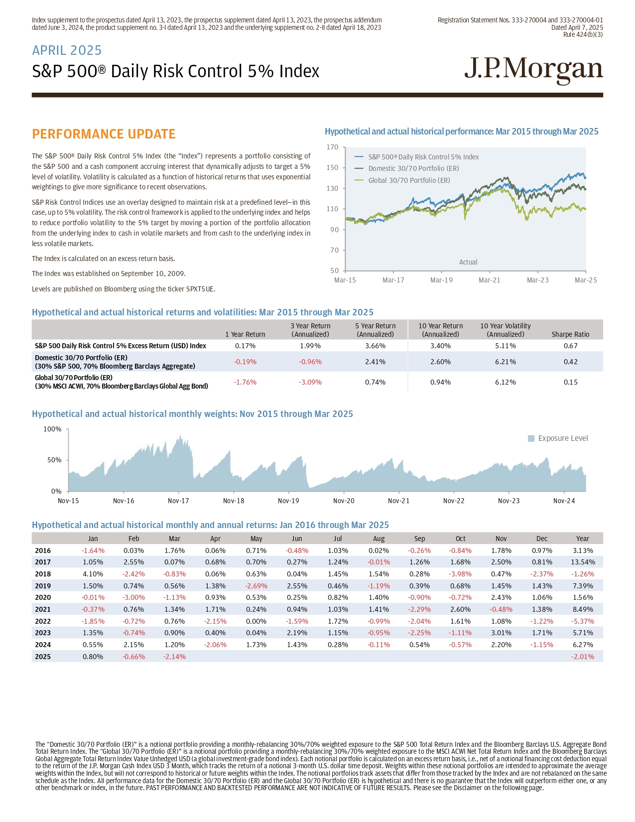 日期为2023年4月13日的招股章程的指数补充、日期为2023年4月13日的招股章程补充、日期为2024年6月3日的招股章程增编、日期为2023年4月13日的产品补充第3-I号及日期为2023年4月18日的基础补充第2-II号注册声明,日期为4月7日的第333-270004号及第333-270004-01号,2025年规则第424(b)(3)条2025年4月标普 500®每日风险控制5%指数“国内30/70 Portfolio(ER)”是一个提供每月再平衡30%/70%的标普 500全回报指数和彭博巴克莱银行 US. S. Aggregate Bond Total Return Index加权敞口的名义投资组合。“Global 30/70 Portfolio(ER)”是一个名义投资组合,提供每月再平衡30%/70%的MSCI ACWI净总回报指数和彭博巴克莱银行Global Aggregate Total Return Index Value Unhedged USD(一种全球投资级债券指数)加权敞口。每个名义投资组合均以超额收益为基础计算,即:,扣除名义融资成本扣除后等于J. P. Morgan现金指数3个月美元的回报,该指数追踪名义3个月美元定期存款的回报。这些名义投资组合中的权重旨在近似于指数内的平均权重,但不会对应于指数内的历史或未来权重。名义投资组合跟踪的资产与指数跟踪的资产不同,不会与指数在同一时间表上进行再平衡。国内30/70投资组合(ER)和全球30/70投资组合(ER)的所有表现数据均为假设性数据,无法保证该指数未来将跑赢任一基准或任何其他基准或指数。过去的表现和经过测试的表现并不代表未来的结果。请看下一页的免责声明。业绩更新标普 500指数®每日风险控制5%指数(“指数”)表示由标普 500指数和应计利息的现金成分组成的投资组合,该成分动态调整以5%的波动率水平为目标。波动性被计算为历史回报的函数,它使用指数加权来赋予最近的观察更多的意义。标普风控指数使用一种叠加层,旨在将风险保持在一个预先定义的水平——在这种情况下,波动性最高可达5%。风险控制框架应用于标的指数,通过在波动市场中将一部分投资组合配置从标的指数转移到现金,在波动较小的市场中从现金转移到标的指数,帮助将投资组合波动性降低到5%的目标。该指数按超额收益计算。该指数成立于2009年9月10日。等级使用股票代码SPXT5UE在彭博上发布。假设和实际历史表现:2015年3月至2025年3月5070901101301501703月-3月15日-3月17日-3月19日-3月21日-3月23日-25日标普 500®每日风险控制5%指数国内30/70组合(ER)全球30/70组合(ER)实际假设和实际历史收益和波动率:2015年3月至2025年3月夏普比率10年波动率(年化)10年回报(年化)5年回报(年化)3年回报(年化)1年回报0.675.11% 3.40% 3.66% 1.99% 0.17% 标普 500每日风控5%超额回报(美元)指数0.426.21% 2.60% 2.41%-0.96%-0.19%国内30/70投资组合(ER)(30% 标普 500,70%彭博巴克莱银行 Aggregate)0.156.12% 0.94% 0.74%-3.09%-1.76% Global 30/70 Portfolio(ER)(30% MSCI ACWI,70%彭博巴克莱银行 Global AGG Bond)假设和实际历史月权重:2015年11月至2025年3月100% 0% 50% 11月-11月15日-11月16日-11月17日-11月18日-11月19日-11月20日-11月21日-11月22日-11月23日-24日风险暴露水平假设和实际历史月权重年度回报:2016年1月至2025年3月年度12月11月10月9月8月7月6月5月3月2月1月3.13% 0.97% 1.78%-0.84%-0.26% 0.02% 1.03%-0.48% 0.71% 0.06% 1.76% 0.03%-1.64% 2016年13.54% 0.81% 2.50% 1.68% 1.26%-0.01% 1.24% 0.27% 0.70% 0.68% 0.07% 2.55% 1.05% 2017年-1.26%-2.37% 0.47%-3.98% 0.28% 1.54% 1.45% 0.04% 0.63% 0.06%-0.83%-2.42% 4.10% 20187.39% 1.43% 1.45% 0.68% 0.39%-1.19% 0.46% 2.55%-2.69% 1.38% 0.56% 0.74% 1.50% 20191.56% 1.06%0.93% - 1.13% - 3.00% - 0.01% 2020 8.49% 1.38% - 0.48% 2.60% - 2.29% 1.41% 1.03% 0.94% 0.24% 1.71% 1.34% 0.76% - 0.37% 2021 - 5.37% - 1.22% 1.08% 1.61% - 2.04% - 0.99% 1.72% - 1.59% 0.00% - 2.15% 0.76% - 0.72% - 1.85% 2022 5.71% 1.71% 3.01% - 1.11% - 2.25% - 0.95% 1.15% 2.19% 0.04% 0.40% 0.90% - 0.74% 1.35% 2023 6.27% - 1.15% 2.20% - 0.57% 0.54% - 0.11% 0.28% 1.43% 1.73% - 2.06% 1.20% 2.15% 0.55% 2024 - 2.01% - 2.14% - 0.66% 0.80% 2025
