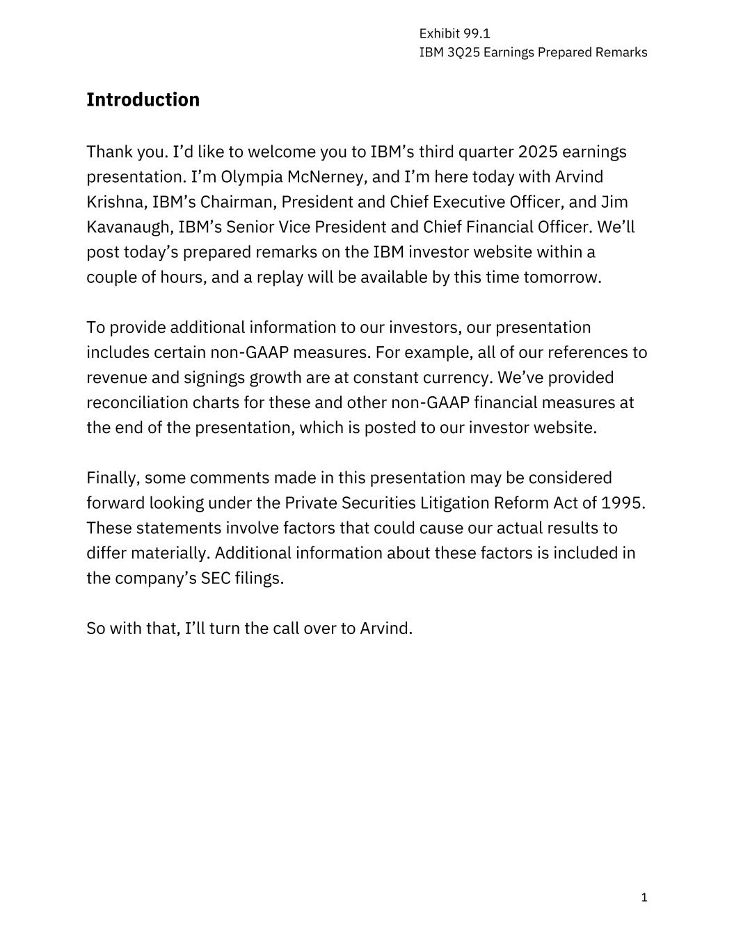 IBM 3Q25收益编制备注1介绍谢谢。我想欢迎您参加IBM 2025年第三季度收益报告会。我是Olympia McNerney,今天与IBM董事长、总裁兼首席执行官Arvind Krishna以及首席财务官的高级副总裁兼TERM3的Jim Kavanaugh一起来到这里。我们会在几个小时内将今天准备好的评论发布在IBM投资者网站上,明天这个时候将会有重播。为了向我们的投资者提供更多信息,我们的演示文稿包括某些非公认会计原则措施。例如,我们所有提到的收入和签约增长都是按固定汇率计算的。我们在演示文稿的末尾提供了这些和其他非GAAP财务指标的调节图表,该图表发布在我们的投资者网站上。最后,根据1995年《私人证券诉讼改革法案》,本演示文稿中的一些评论可能被认为是前瞻性的。这些陈述涉及可能导致我们的实际结果存在重大差异的因素。有关这些因素的更多信息包含在该公司提交给SEC的文件中。因此,我将把电话转给Arvind。附件 99.1