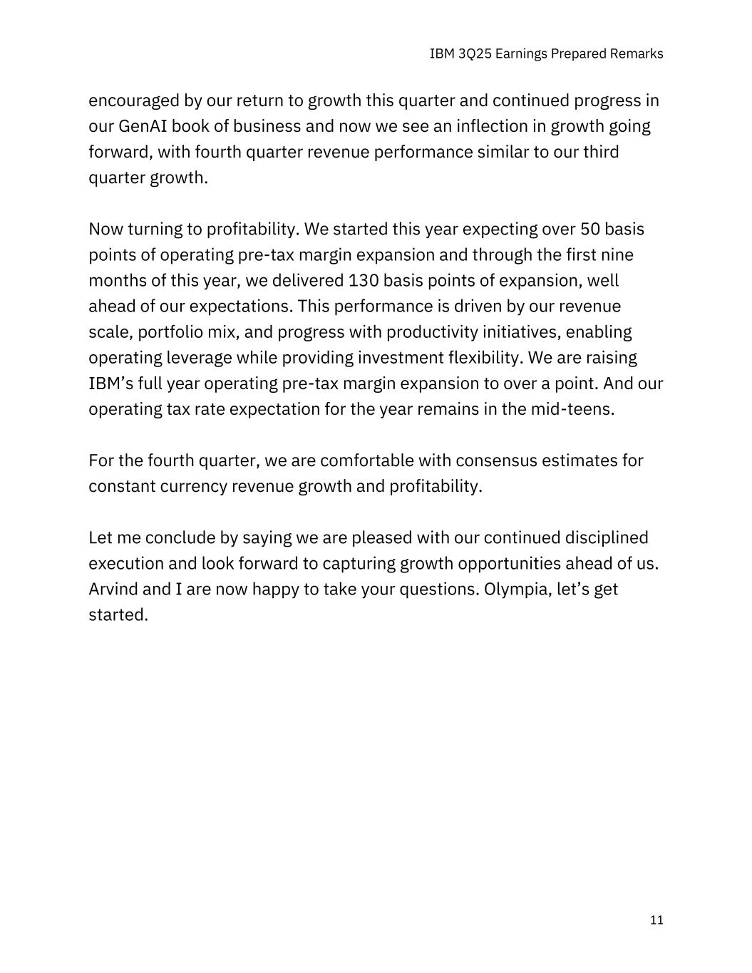 对于我们本季度恢复增长以及GenAI业务账簿继续取得进展,现在我们看到了未来增长的拐点,第四季度的收入表现与我们第三季度的增长相似,这让IBM在2015年第三季度的收益准备评论11受到鼓舞。现在转向盈利。我们从今年开始预计经营税前利润率将扩大50个基点以上,到今年前九个月,我们实现了130个基点的扩张,远远超出了我们的预期。这一业绩是由我们的收入规模、投资组合组合以及生产力计划的进展推动的,在提供投资灵活性的同时实现了经营杠杆。我们将IBM的全年运营税前利润率扩张幅度提高到了一个点以上。而我们对今年营业税率的预期仍保持在十几岁左右。对于第四季度,我们对恒定货币收入增长和盈利能力的普遍预期感到满意。最后,我要说的是,我们对持续严格的执行感到高兴,并期待抓住我们面前的增长机会。Arvind和我现在很乐意回答你们的问题。奥林匹亚,让我们开始吧。
