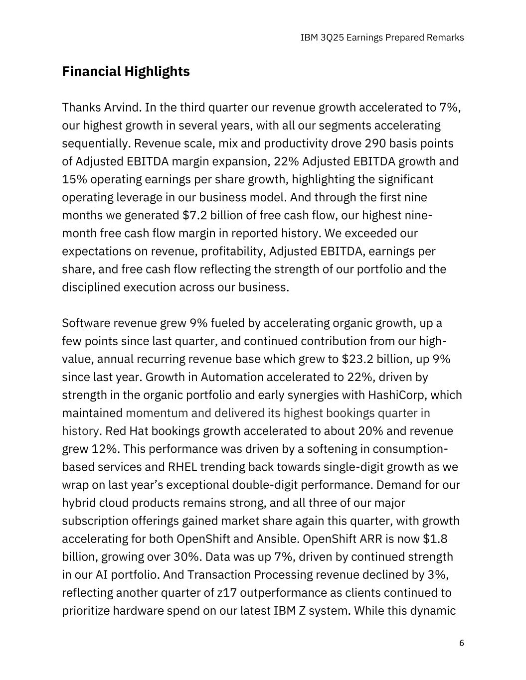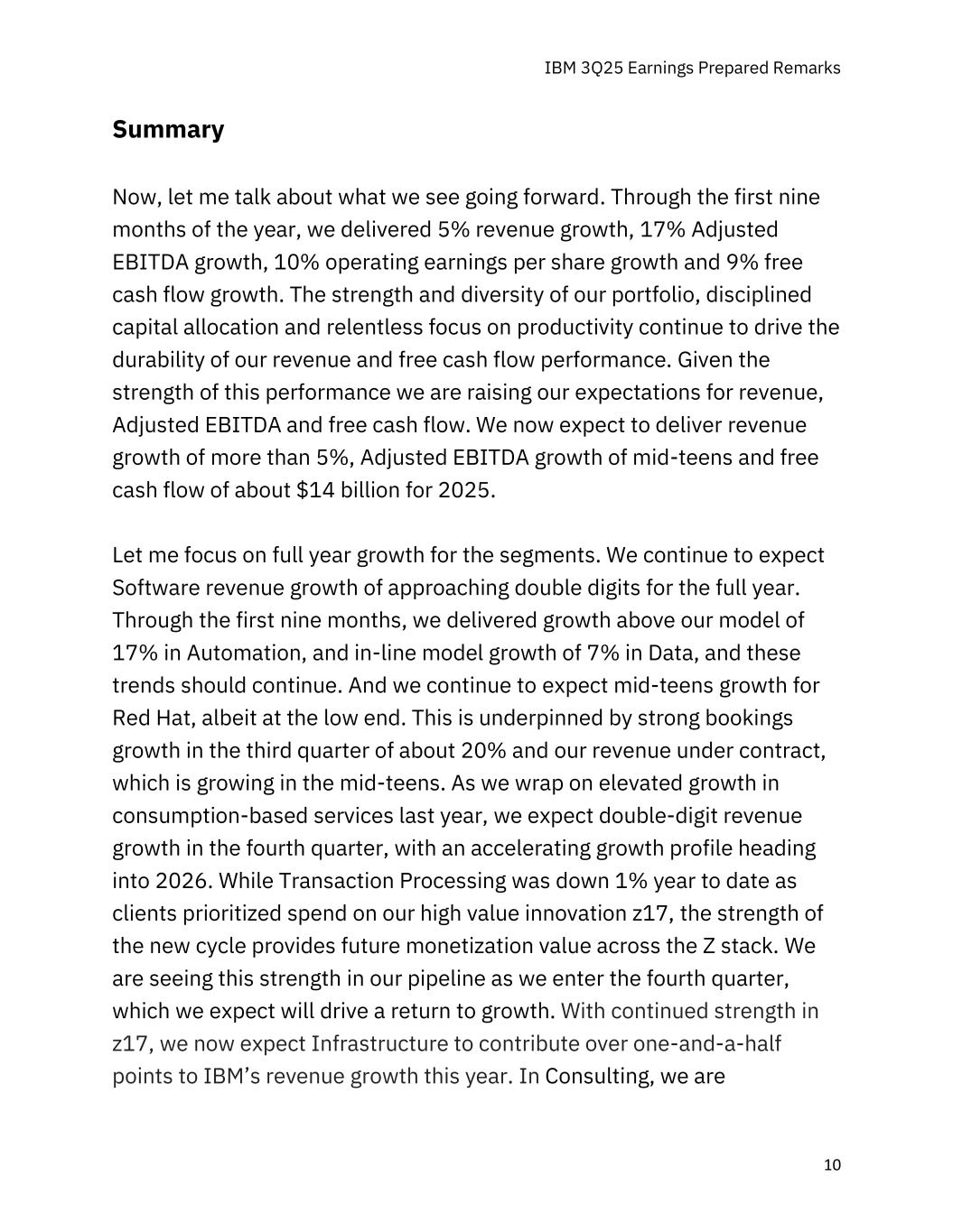 IBM 3Q25 Earnings Prepared Remarks 10 Summary Now,let me talk about what we see future。今年前九个月,我们实现了5%的收入增长、17%的调整后EBITDA增长、10%的每股经营收益增长和9%的自由现金流增长。我们投资组合的实力和多样性、严格的资本配置以及对生产力的不懈关注,继续推动我们收入和自由现金流表现的持久性。鉴于这一业绩表现强劲,我们提高了对收入、调整后EBITDA和自由现金流的预期。我们现在预计2025年将实现超过5%的收入增长、十几岁的调整后EBITDA增长和约140亿美元的自由现金流。让我重点谈谈各细分领域的全年增长情况。我们继续预计全年软件收入增长接近两位数。在前九个月,我们在自动化方面实现了超过我们的模型17%的增长,在数据方面实现了7%的内联模型增长,这些趋势应该会持续下去。我们继续预计红帽将出现十几岁左右的增长,尽管处于低端。这得益于第三季度约20%的强劲预订量增长以及我们的合同收入,该收入在十几岁左右增长。随着我们总结去年基于消费的服务的高增长,我们预计第四季度的收入将实现两位数的增长,并在2026年实现加速增长。尽管由于客户优先考虑在我们的高价值创新z17上进行支出,交易处理今年迄今下降了1%,但新周期的实力为整个Z堆栈提供了未来的货币化价值。随着我们进入第四季度,我们在管道中看到了这种实力,我们预计这将推动恢复增长。随着z17的持续走强,我们现在预计基础设施将为IBM今年的收入增长贡献超过一个半百分点。在咨询中,我们是