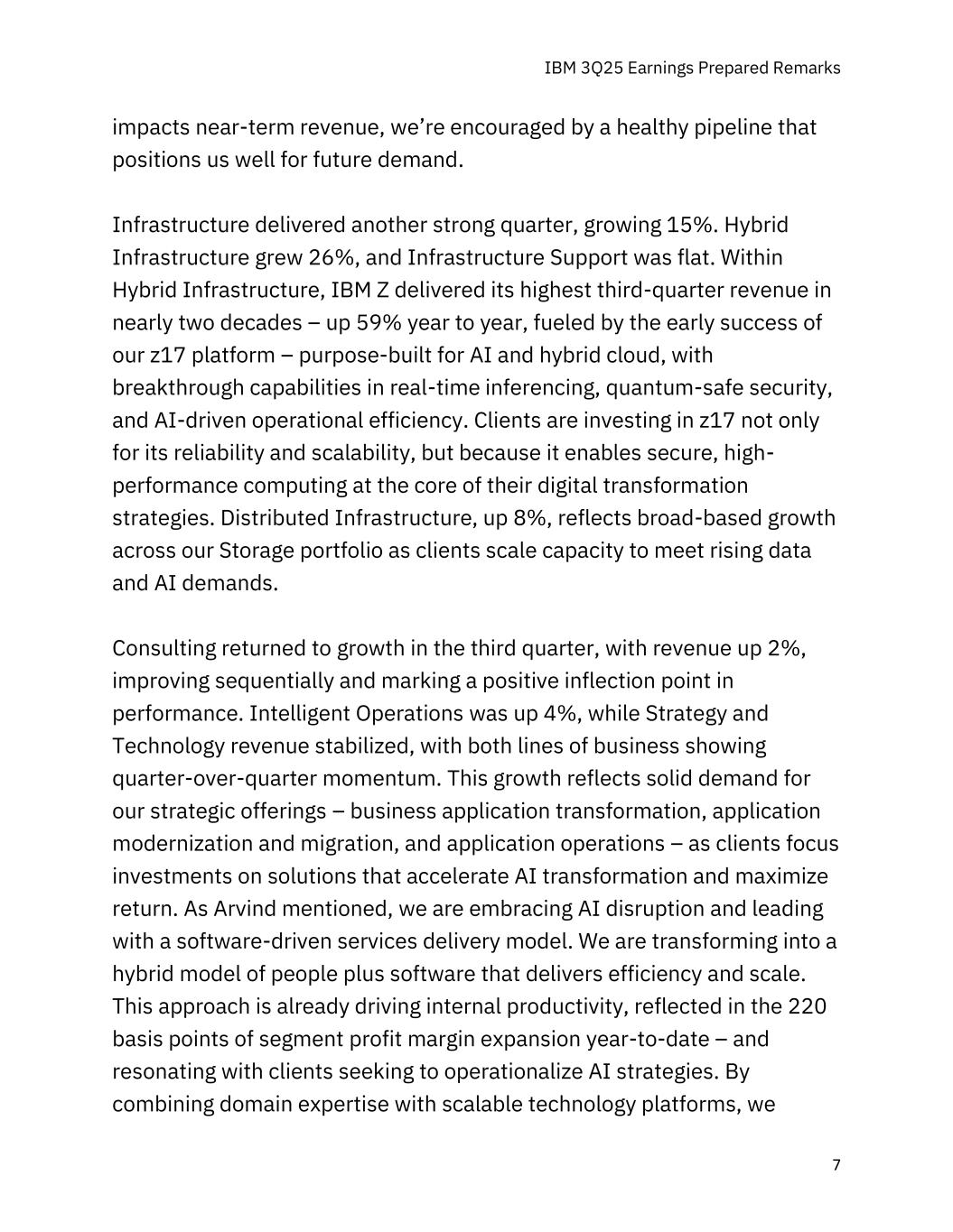 IBM 2015年第三季度收益准备好的评论7影响近期收入,我们对健康的管道感到鼓舞,这使我们能够很好地应对未来的需求。基础设施又实现了一个强劲的季度,增长了15%。混合基础设施增长26%,基础设施支持持平。在混合基础设施中,IBM Z实现了近二十年来最高的第三季度收入——同比增长59%,这得益于我们专为AI和混合云打造的Z17平台的早期成功,该平台在实时推理、量子安全安全安全和AI驱动的运营效率方面具有突破性能力。客户对Z17进行投资不仅是因为它的可靠性和可扩展性,还因为它能够在其数字化转型战略的核心实现安全、高性能的计算。分布式基础设施增长8%,反映出随着客户扩展容量以满足不断增长的数据和人工智能需求,我们的存储产品组合实现了广泛的增长。咨询Q3重回增长,营收增长2%,环比改善,标志业绩正向拐点。智能运营涨4%,思略特营收企稳,两条业务线均呈现环比增长势头。这一增长反映了对我们的战略产品——业务应用程序转型、应用程序现代化和迁移以及应用程序运营——的强劲需求,因为客户将投资重点放在加速人工智能转型和最大化回报的解决方案上。正如Arvind所提到的,我们正在拥抱人工智能颠覆,并以软件驱动的服务交付模式处于领先地位。我们正在转变为提供效率和规模的人加软件的混合模式。这种方法已经在推动内部生产力,这反映在今年迄今部门利润率扩张220个基点上——并与寻求实施人工智能战略的客户产生共鸣。通过将领域专业知识与可扩展的技术平台相结合,我们