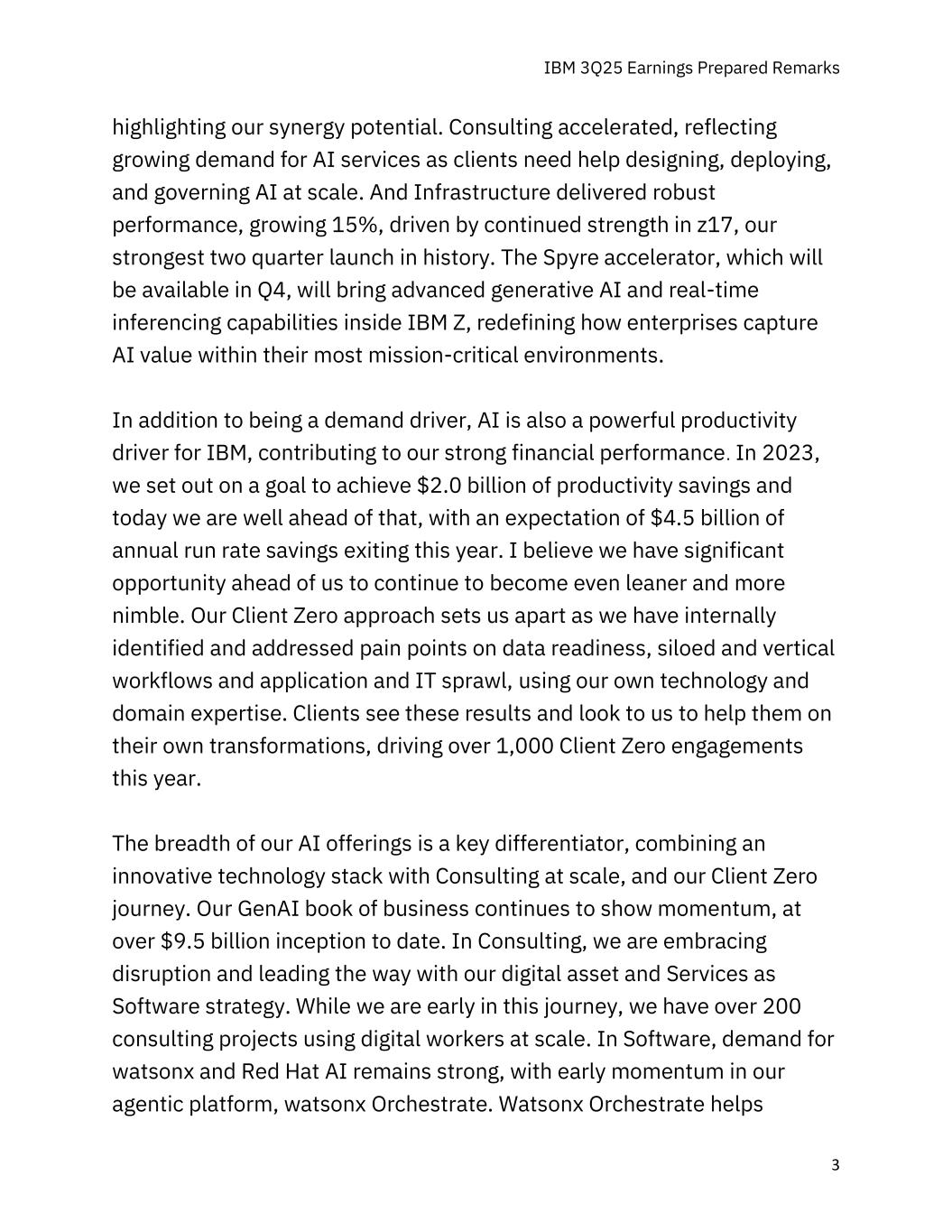 IBM 2015年第三季度收益准备好的评论3突出了我们的协同潜力。咨询加速,反映出对人工智能服务的需求不断增长,因为客户需要帮助大规模设计、部署和管理人工智能。基础设施表现强劲,增长15%,这得益于Z17持续走强,这是我们历史上最强劲的两个季度发布。将于第四季度上市的Spyre加速器将在IBM Z内部带来先进的生成式AI和实时推理能力,重新定义企业如何在其最关键的任务环境中捕获AI价值。除了是需求驱动力之外,人工智能还是IBM强大的生产力驱动力,为我们强劲的财务业绩做出了贡献。2023年,我们制定了实现20亿美元生产力节约的目标,今天我们远远领先于这一目标,预计今年将实现45亿美元的年度运行率节约。我相信,摆在我们面前的是继续变得更精干、更灵活的重要机会。我们的Client Zero方法使我们与众不同,因为我们利用我们自己的技术和领域专业知识,在内部确定并解决了数据就绪、孤立和垂直工作流程以及应用程序和IT扩展方面的痛点。客户看到这些结果,期待我们帮助他们进行自己的转型,今年推动了超过1000个客户零参与。我们AI产品的广度是一个关键的差异化因素,它将创新技术堆栈与大规模咨询以及我们的客户零之旅相结合。我们的GenAI业务账簿继续显示出势头,迄今为止成立时已超过95亿美元。在Consulting中,我们正在拥抱颠覆,并以我们的数字资产和服务作为软件战略引领潮流。虽然我们处于这一旅程的早期阶段,但我们有超过200个咨询项目大规模使用数字工作者。在软件领域,对watsonx和红帽 AI的需求仍然强劲,在我们的代理平台watsonx Orchestrate中具有早期势头。Watsonx Orchestrate帮助