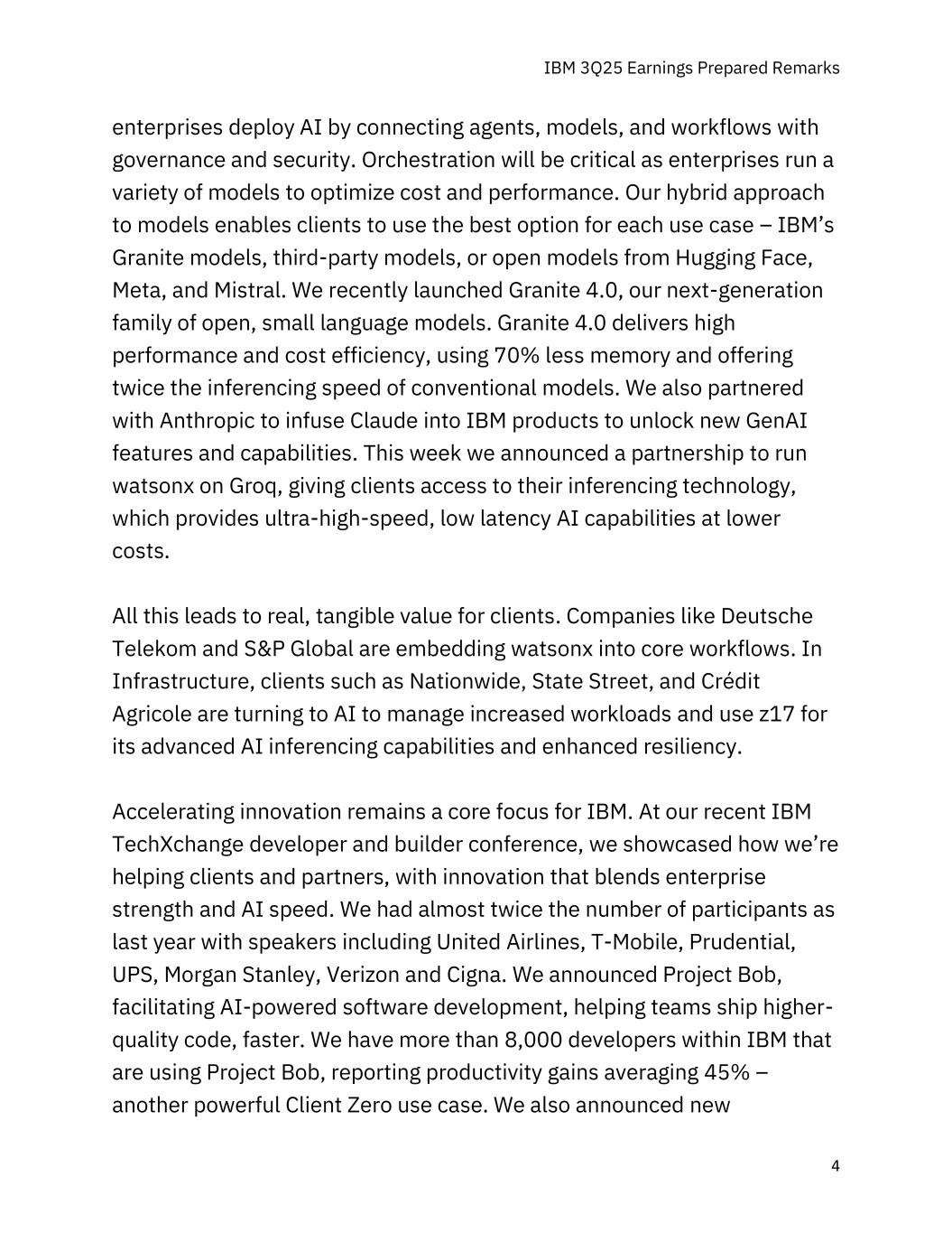 IBM 3Q25 Earnings Prepared Remarks 4家企业通过将代理、模型和工作流程与治理和安全相连接来部署AI。随着企业运行各种模型以优化成本和性能,编排将变得至关重要。我们对模型的混合方法使客户能够为每个用例使用最佳选项– IBM的花岗岩模型、第三方模型,或来自Hugging Face、Meta和Mistral的开放模型。我们最近推出了Granite 4.0,这是我们的下一代开放式小语言模型家族。Granite 4.0提供了高性能和成本效率,使用的内存减少了70%,并提供了两倍于传统型号的推理速度。我们还与Anthropic合作,将Claude注入IBM产品,以解锁新的GenAI特性和能力。本周,我们宣布建立合作伙伴关系,在Groq上运行watsonx,让客户可以使用他们的推理技术,该技术以更低的成本提供超高速、低延迟的AI功能。所有这些都为客户带来了真正的、有形的价值。德国电信和标普全球等公司正在将watsonx嵌入核心工作流程中。在基础设施领域,Nationwide、道富和法国农业信贷银行等客户正在转向人工智能来管理增加的工作量,并将z17用于其先进的人工智能推理能力和增强的弹性。加速创新仍然是IBM的核心关注点。在最近的IBM TechXchange开发者和构建者会议上,我们展示了我们如何通过融合企业实力和AI速度的创新来帮助客户和合作伙伴。我们的参与者人数几乎是去年的两倍,发言人包括美国联合航空公司、T-Mobile、保诚、UPS、摩根士丹利、威瑞森通信和信诺。我们宣布了Project Bob,促进AI驱动的软件开发,帮助团队运送更高质量的代码,速度更快。我们在IBM内部有超过8,000名开发人员正在使用Project Bob,报告称生产力平均提高了45% ——这是另一个强大的客户端Zero用例。我们还宣布了新